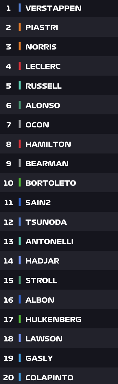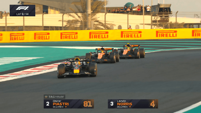 灯灭起步,维斯塔潘领跑,诺里斯第二,皮亚斯特里第三,勒克莱尔上到第四;