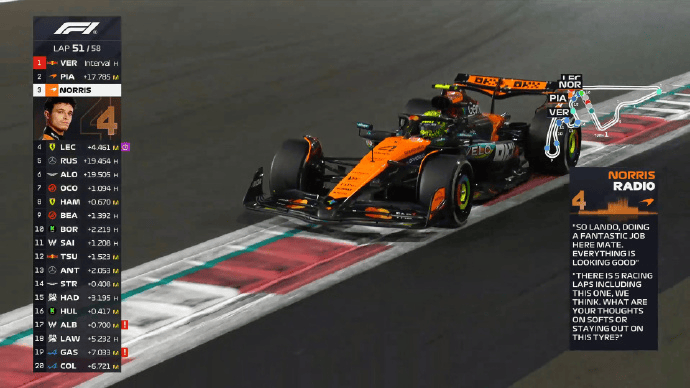 恭喜诺里斯,又一位世界冠军诞生了,max也是真强悬念硬是保留到最后一轮,这要是翻了直接赛车皇帝了🐶,也不得不说赛季中迈凯伦的左右脑互搏,领先这么多的车要是丢冠也别玩了