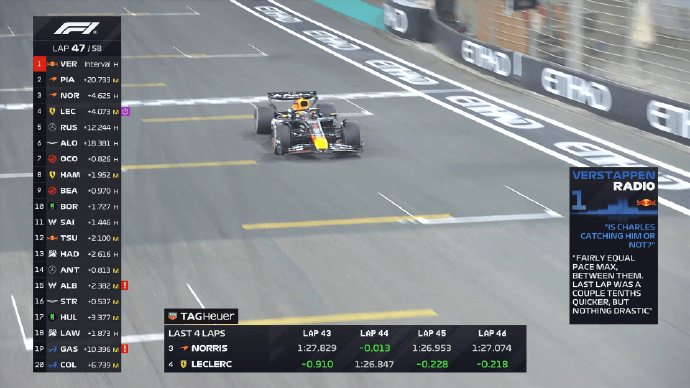 维斯塔潘询问勒克莱尔是否追近诺里斯;