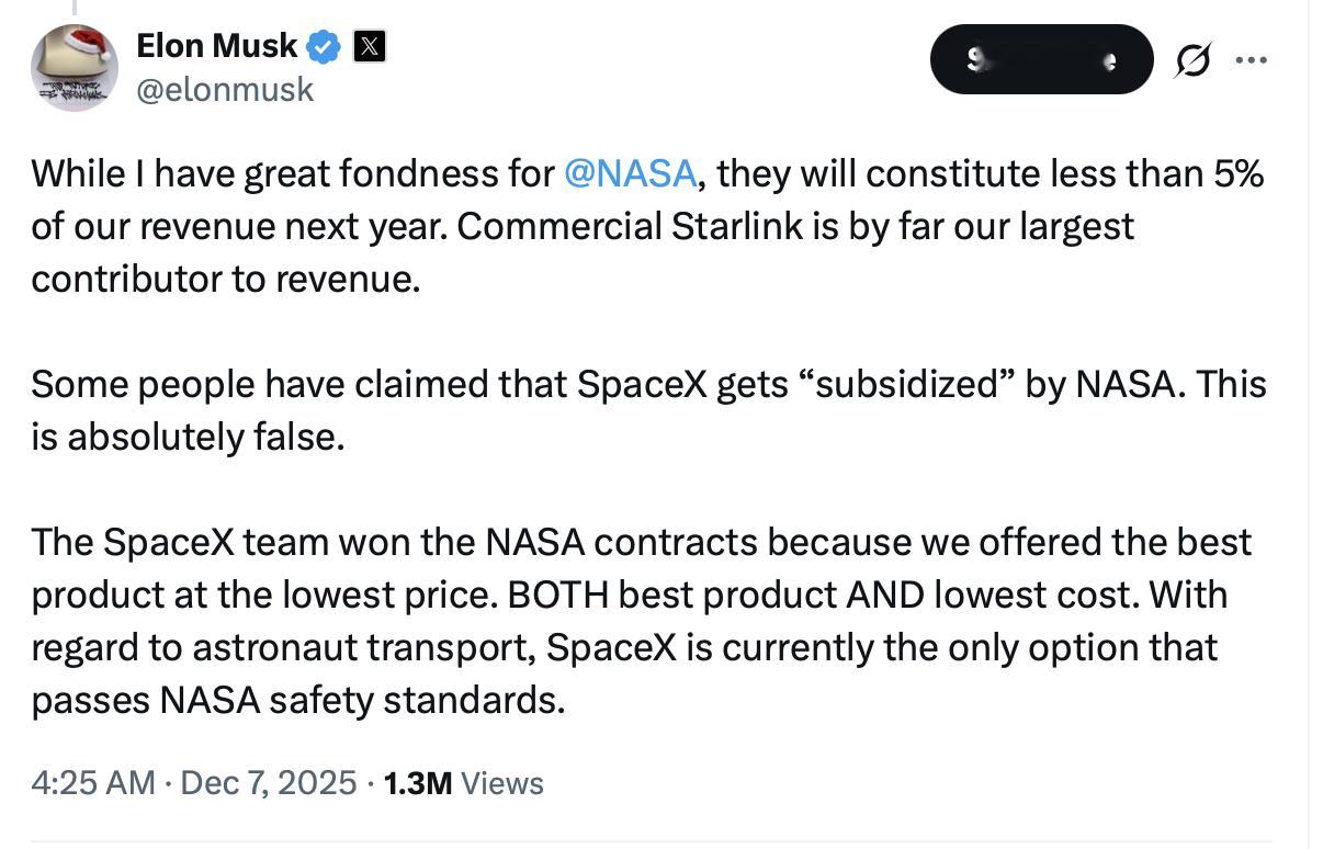 马斯克回应,近期有不少媒体宣称SpaceX正在以8000亿美元估值融资,这种说法并不准确。SpaceX 多年来一直保持正现金流,并且每年两次进行股票回购,为员工和投资者提供流动性。公司的估值提升,取决于星舰( Starship)和星链(Starlink)的进展,以及获取全球直连手机(direct-to-cell)频谱的进度,这将极大扩大SpaceX的可服务市场规模。还有一点,可能是最重要的一点:尽管SpaceX对NASA怀有深厚的感情,但明年NASA在SpaceX营收中的占比将低于 5%。商业版星链才是SpaceX收入的绝对主力。有人声称SpaceX 受到了NASA 的“补贴”。这种说法完全错误。SpaceX能赢得NASA的合同,是因为SpaceX以最低的价格,提供了最好的产品,既是最优性能,也是最低成本。在载人航天方面,目前唯一通过 NASA安全标准、可用于宇航员运输的方案,就是 SpaceX。