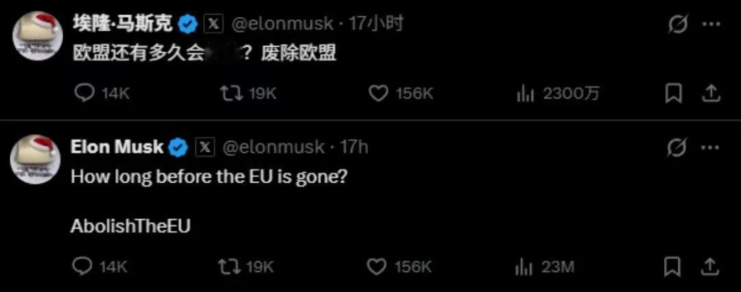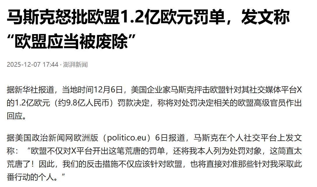 马斯克重返政坛,要废除欧盟 当地时间12月6日,马斯克发文呼吁废除欧盟,并且他表示:并不是开玩笑! 他批评欧盟为官僚怪兽,暗示它的结构规则和监管体系对欧洲、对公司非常不利,因此他希望能够将权力还给欧洲各国政府,而不是继续由欧盟统一管理。 为什么马斯克会炮轰欧盟? 在12月,由于他的社交媒体平台被欧盟委员会处以1.2亿欧元的罚款,欧盟认为违反了新数字法规,随后马斯克便发文吐槽了。 而这已经不是马斯克第一次对欧盟发出不满的声音,只不过这次1.2亿欧元的罚单,把他的怒火彻底点燃了,这笔罚款可不是凭空开出的,欧盟委员会在公报里写得明明白白,三项违规行为一分不差:蓝标认证的误导性设计罚4500万欧元,广告资料库不透明罚3500万欧元,拒绝向研究人员开放公共数据再罚4000万欧元。 这位以“嘴炮”闻名的富豪可没打算忍气吞声,直接在欧盟的公告下怼了句“胡扯”,转头就喊出“欧盟应该被废除”,还特意配上口号强调不是开玩笑。 要说马斯克和欧盟的梁子,早不止这一桩,就说特斯拉的全自动驾驶(FSD)系统,在欧洲就没顺过,荷兰车辆管理局直接否认曾承诺批准FSD,明确表示特斯拉连完整的合规材料都没交齐,德国监管机构更直白,嫌特斯拉的“纯视觉”方案少了激光雷达,安全性不够格。 还有,欧盟新出的《人工智能法案》还添了伦理审查关,马斯克之前就吐槽过欧洲审批“慢得离谱”,只是那时没把“废除欧盟”挂在嘴边。 而且,欧盟这两年的监管铁拳确实越来越硬,不光针对马斯克,今年4月刚给苹果、Meta分别开了5亿和2亿欧元的罚单,依据的是另一部《数字市场法案》,这套“组合拳”打下来,美国科技圈早有怨言,连美国副总统万斯都出来帮腔,说欧盟是“拿烂理由攻击美国企业”。 有意思的是,马斯克这声“废除欧盟”还意外收获了梅德韦杰夫的点赞,这位俄罗斯前总统秒回“完全正确”了,只不过两边心思完全不同,俄罗斯是常年看欧盟不顺眼,马斯克则是单纯被监管逼得冒火,欧盟官员倒显得淡定,强调罚款“比例适当”,还甩下句“遵守规则就不会被罚”的硬话。 说到底,马斯克的暴怒本质上是企业利益和监管权力的正面碰撞,他旗下的X平台要靠宽松环境赚流量,特斯拉要靠快速落地新技术抢市场,可欧盟偏要做“规则守护者”,又是查内容又是审技术,这种矛盾早晚会爆发,1.2亿欧元不过是根导火索。 至于“废除欧盟”的呼吁,更像气头上的狠话,且不说欧盟是几十年的政治实体,单说特斯拉在德国的工厂、X平台在欧洲的千万用户,马斯克也舍不得真跟欧洲彻底撕破脸,但这声怒吼确实戳中了美欧之间的裂痕——一边是欧盟要维护数字主权,一边是美国科技巨头想挣脱束缚,这场拉锯战恐怕会很漫长。