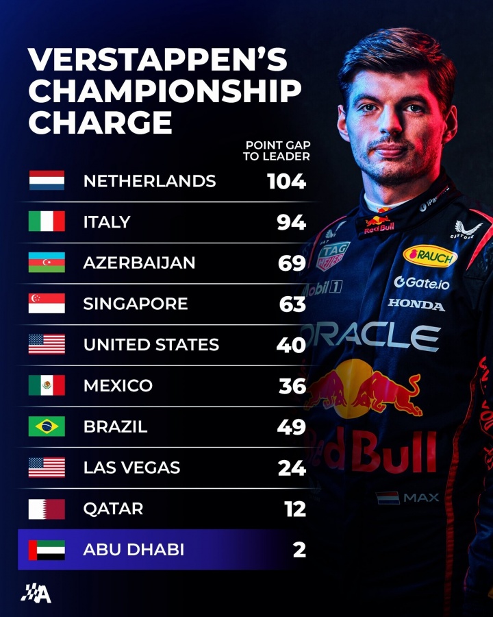 2025赛季,维斯塔潘在车手积分榜上一度落后榜首达到104分,最后追到只剩2分。