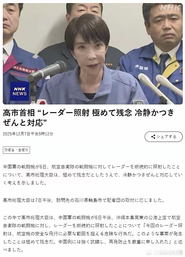 事关中日海空态势!高市早苗就辽宁舰训练事件正式表态12月7日,日本首相高市早苗就辽宁舰编队训练相关事件作出回应,指责中方歼-15雷达照射日机为“危险行为”,提出所谓“强烈抗议”,并强调日方将“冷静且坚决”应对。事实是,辽宁舰在宫古海峡以东海域的训练事先已公布海空域,完全符合国际法准则,而日方F-15战机多次抵近滋扰,才是危及飞行安全的根源。中方国防部已明确驳斥日方炒作,指出其纯属倒打一耙。此前高市早苗错误言论已引发外交风波,日方对抗行动正逐步向军事领域转移。中方秉持克制,但挑事者终担其责,若日方持续生事,一切后果需自行承担!