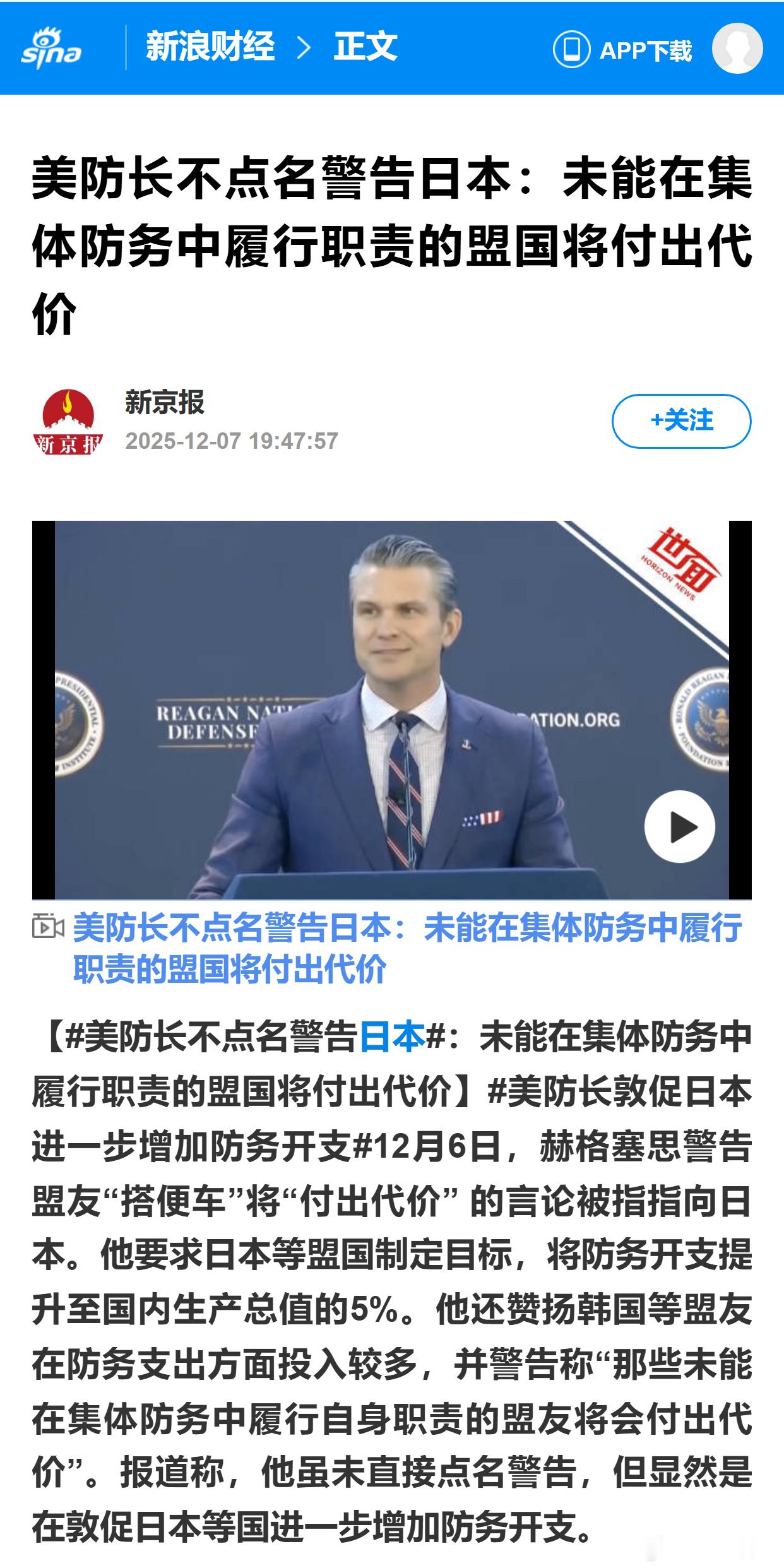 美防长不点名警告日本:未能在集体防务中履行职责的盟国将付出代价