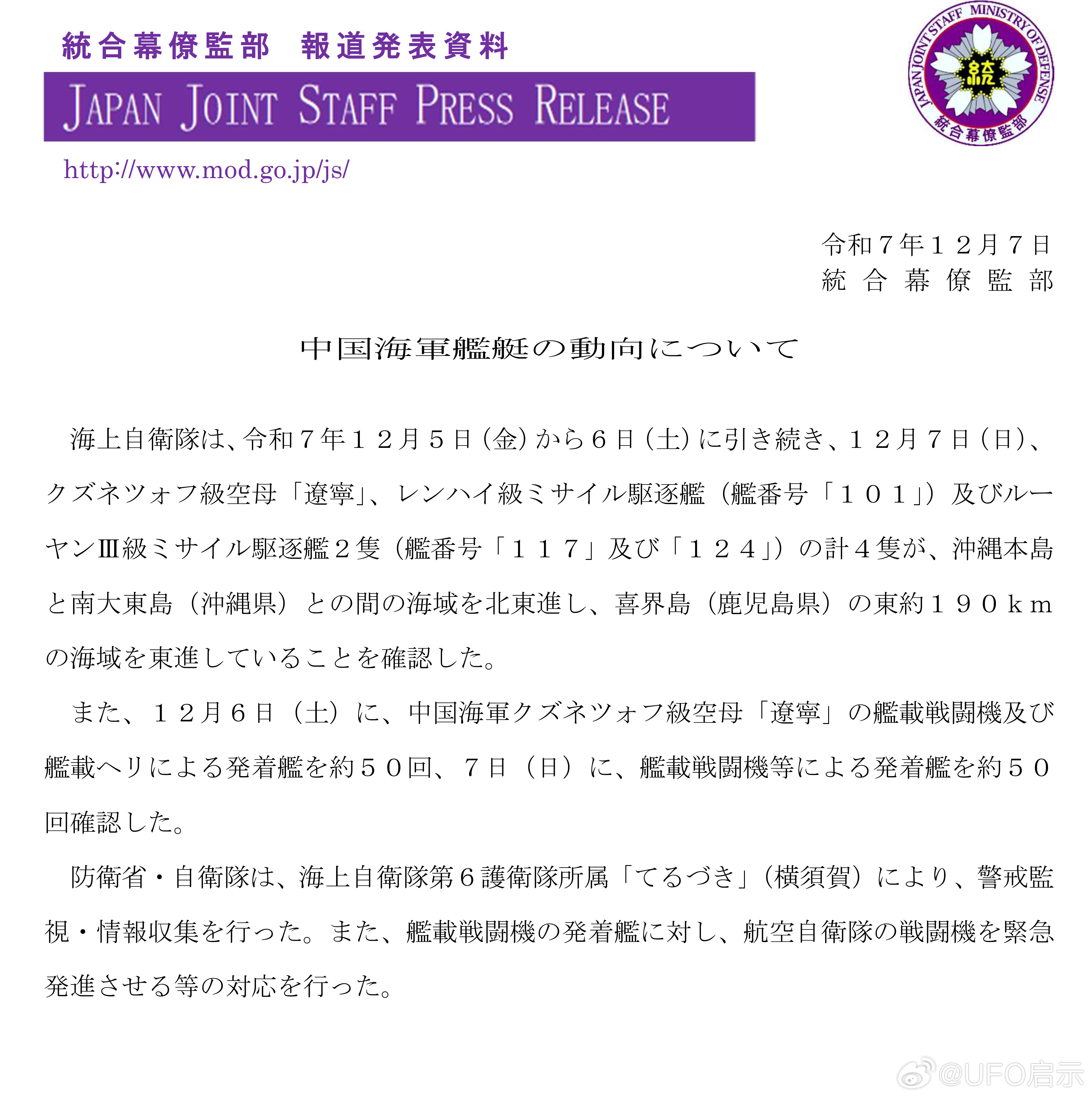 日本防卫省表示:12月7日,包括辽宁舰在内的数艘中国海军舰艇在冲绳岛和南大东岛之间的海域向东北方向航行,并在鬼界岛以东约190公里的海域向东航行。同时证实辽宁号航母上的舰载战斗机进行了起降