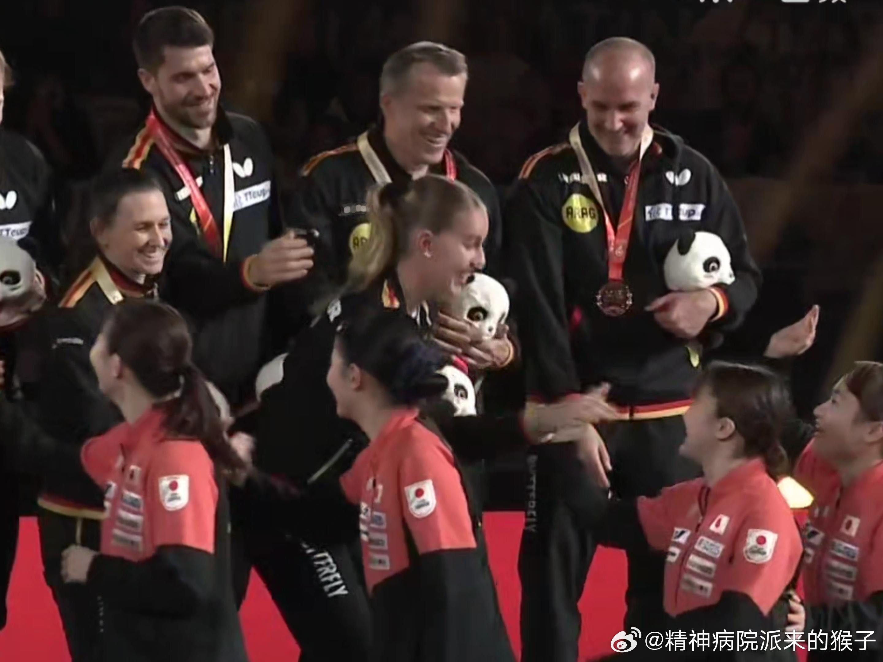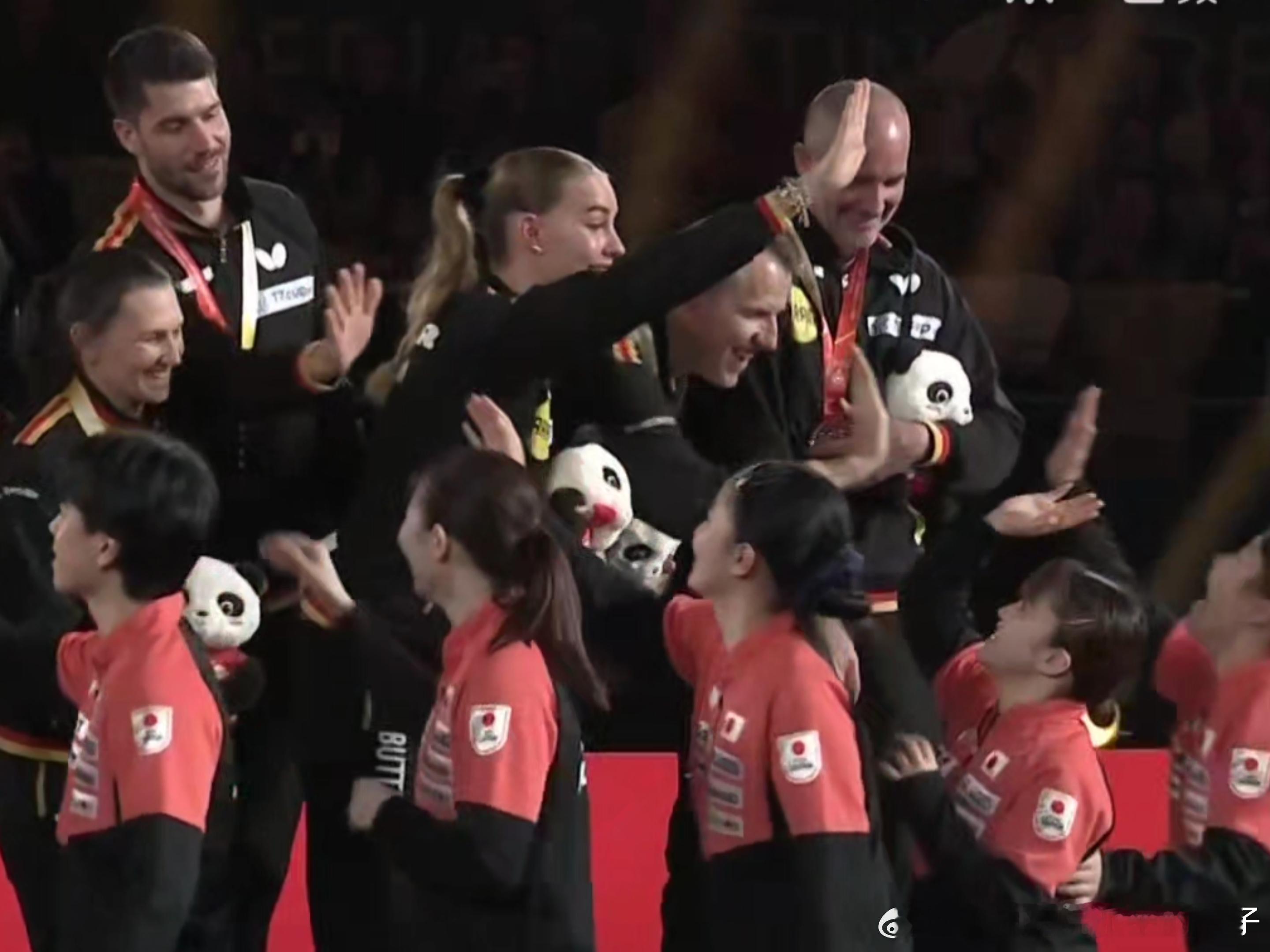 2025年国际乒联成都混合团体世界杯185的考夫蔓“欺负”152的大藤沙月和伊藤美诚(不是😂击掌的时候故意把手拿高点,Mima蹦起来拍
