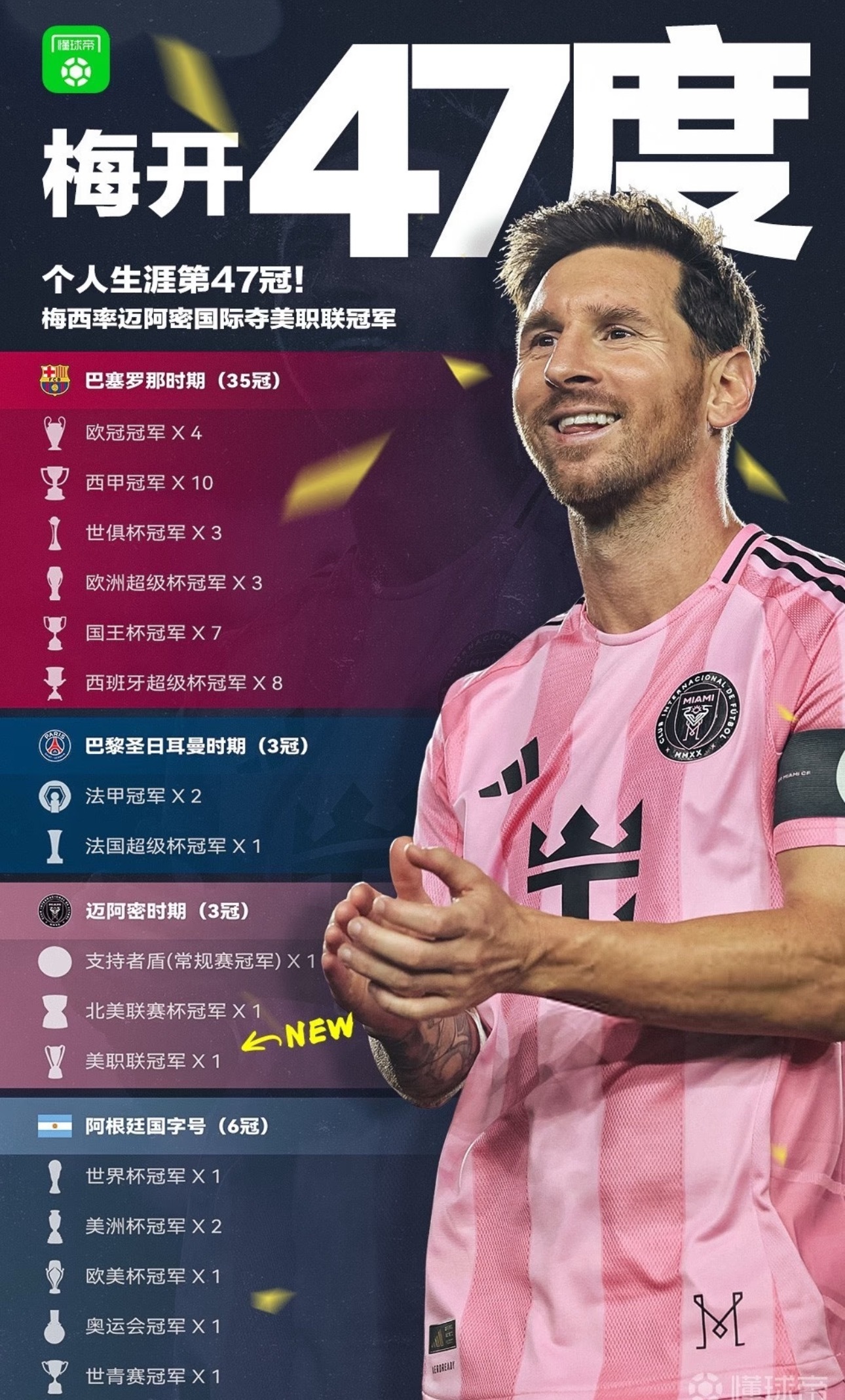 38岁球王再创历史 梅西蝉联美职联MVP率队首夺总冠军北京时间12月7日,美职联总决赛落下帷幕,迈阿密国际3-1击败温哥华白浪,队史首次捧起美职联总冠军奖杯,38岁的梅西则以统治级表现,不仅斩获总决赛MVP,更实现美职联官方MVP两连庄,成为赛事历史首位达成此成就的球员,将职业生涯第47座冠军收入囊中。本赛季梅西为迈阿密国际出战28场美职联比赛,交出29球19助攻的豪华数据,场均参与进球超1.7个,进攻端的输出堪称无解。而在更关键的季后赛阶段,他6场比赛贡献6球7助,成为球队晋级的绝对核心;总决赛中他虽未收获进球,却送出两次精妙助攻主导比赛走势,全场8次过人、3次关键传球的数据均为全场最高,用全能表现扛着球队登顶。从2023年加盟时球队身处东部垫底,到2024年率队拿下常规赛冠军并首夺美职联MVP,再到2025年实现冠军与个人荣誉的双丰收,梅西仅用两年多时间就将迈阿密国际从联盟弱旅改造成冠军之师。他不仅打破了美职联MVP无法连庄的魔咒,更成为联赛史上唯一同时包揽赛季MVP、季后赛MVP和总决赛MVP的球员,用实力击碎了“养老”质疑,续写着足坛传奇。