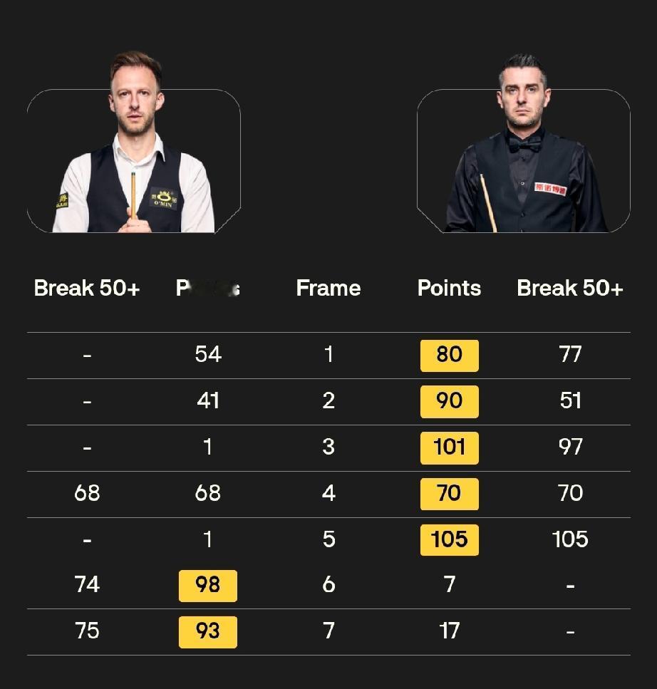马克塞尔比 5-2 贾德·特鲁姆普 2025年斯诺克英锦赛决赛。马克塞尔比打出1杆破百5杆50+,5-2领先贾德·特鲁姆普。