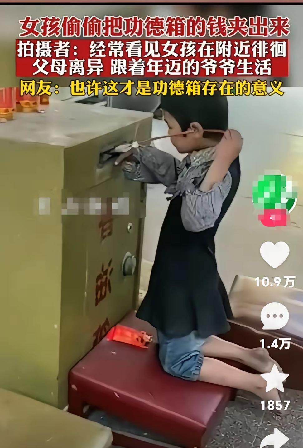 获得了大部分网友的同情,没有被骂的女孩! 小女孩偷偷把寺庙功德箱的钱夹出来,有知情人说,经常看到小女孩在这附近徘徊! 女孩的父母离异,她跟着年迈的爷爷两个人生活。爷爷年纪也大了,没有劳动能力,两个人相依为命! 很多网友说,这也许就是功德箱存在的意义,佛祖也不会怪罪的! 监控画面里的一幕,看得人鼻子发酸!小女孩也就七八岁的样子,扎着歪歪扭扭的马尾,身上的衣服洗得发白,还不合身。她趁着寺庙里没人注意,踮着脚尖凑到功德箱前,小手伸进投币口,小心翼翼地夹出几张零钱,攥在手心后,飞快地低着头跑出了寺庙,跑的时候还忍不住回头望了两眼,生怕被人发现。 寺庙的僧人后来回忆,这孩子确实经常在寺庙周围徘徊,有时候会蹲在墙角看其他小朋友吃零食,有时候会盯着寺庙里的香火发呆,僧人看她可怜,偶尔会给她递点馒头、水果,她每次都接过就跑,从不说话。直到看到监控,僧人才明白,这孩子徘徊这么久,原来是为了功德箱里的钱。 知情人透露,小女孩的爷爷今年快70岁了,身体不好,常年卧病在床,没有劳动能力。父母在她3岁时就离异了,父亲外出打工后再也没回来,母亲改嫁后也很少联系,祖孙俩只能靠着政府的低保和邻居们的接济勉强生活。“孩子太懂事了,知道爷爷吃药需要钱,看到别的小朋友能给爷爷买好吃的,她也想做点什么。”知情人说,有一次看到小女孩在药店门口徘徊,手里攥着皱巴巴的几块钱,想买最便宜的感冒药,却不够钱,最后只能失望地离开。 小女孩偷钱的视频被发到网上后,没想到网友们没有一句指责,反而满屏都是心疼和同情。有网友留言:“这哪是偷,这是走投无路的求助!功德箱里的钱本就是用来帮助有需要的人,这孩子比很多贪得无厌的人更配得上这份‘功德’。” 还有网友说:“佛祖慈悲,看到这孩子的处境,也会心疼的。她偷的不是钱,是活下去的希望。” 更有网友直接发起了捐款,短短一天时间,就筹集了两万多块钱,还有人寄来了衣服、鞋子和药品。 寺庙的住持得知情况后,也特意让人找到了小女孩和她的爷爷。住持没有责备她,反而给她递上了一个红包:“孩子,以后有困难可以直接来找我们,不用做这样的事。功德箱的意义,就是帮助像你这样有需要的人。” 住持还表示,寺庙会长期资助小女孩的生活费和爷爷的医药费,让她能安心上学,不用再为钱发愁。 小女孩拿着红包,低着头小声说了句“谢谢”,眼泪却忍不住掉了下来。爷爷拉着住持的手,老泪纵横:“都是我没用,让孩子受委屈了。” 周围的邻居也纷纷表示,以后会多照顾祖孙俩,有什么困难大家一起帮着解决。 其实,网友们的宽容和善良,恰恰体现了“功德”的真正含义。功德箱里的钱,不是用来装点寺庙的门面,也不是用来积累所谓的“福报”,而是用来帮助那些身处困境、需要帮助的人。小女孩的行为虽然不妥,但她的出发点是为了照顾爷爷,这份孝心和无奈,让人无法苛责。 反观我们身边,有些人为了钱财不择手段,贪赃枉法、坑蒙拐骗,他们才是真正该被指责的人。而这个小女孩,在走投无路时,只是拿走了功德箱里的一点点零钱,却充满了对爷爷的爱和对生活的渴望,这份纯粹和善良,比任何金钱都珍贵。 这件事也让我们看到,这个世界上依然充满了温暖和善意。网友们的捐款、寺庙的资助、邻居的照顾,像一束束光,照亮了小女孩和爷爷的生活,也让我们相信,只要人人都献出一点爱,就没有迈不过去的坎。 有人说,这是功德箱最有意义的一次“支出”。是啊,钱花在了真正需要的人身上,帮助了真正有困难的人,这才是功德的真谛。所谓功德,不在于你捐了多少钱,而在于你是否有一颗善良的心,是否愿意帮助那些身处困境的人。 希望这个小女孩能在大家的帮助下,健康快乐地成长,也希望她能记住这份温暖,长大后把这份善意传递下去。同时,也希望社会能多关注这些困境儿童和孤寡老人,给他们更多的关爱和帮助,让他们不再需要通过“偷”这样的方式来维持生活。 各位读者你们怎么看?欢迎在评论区讨论。