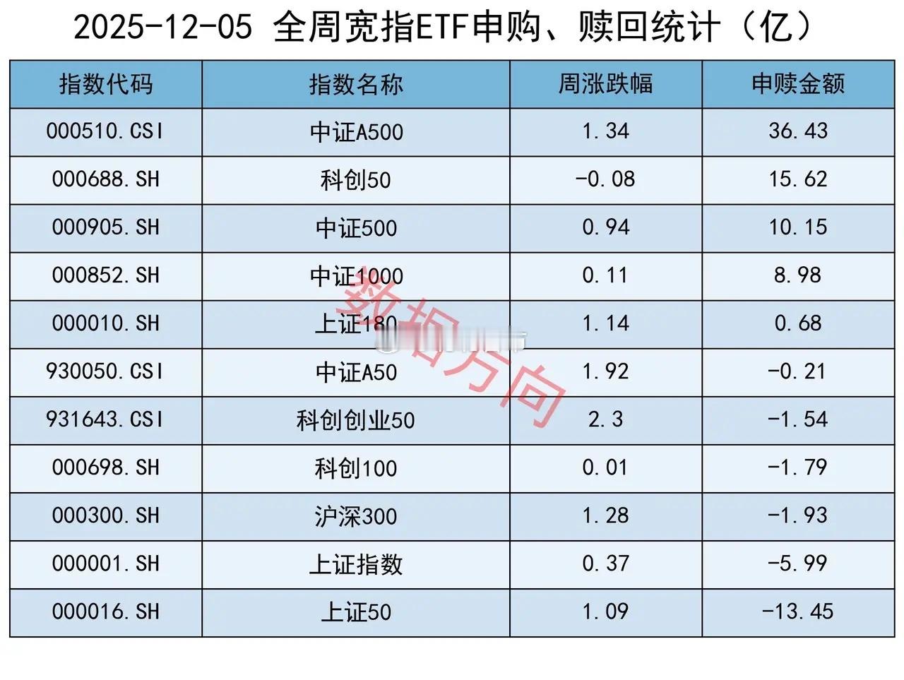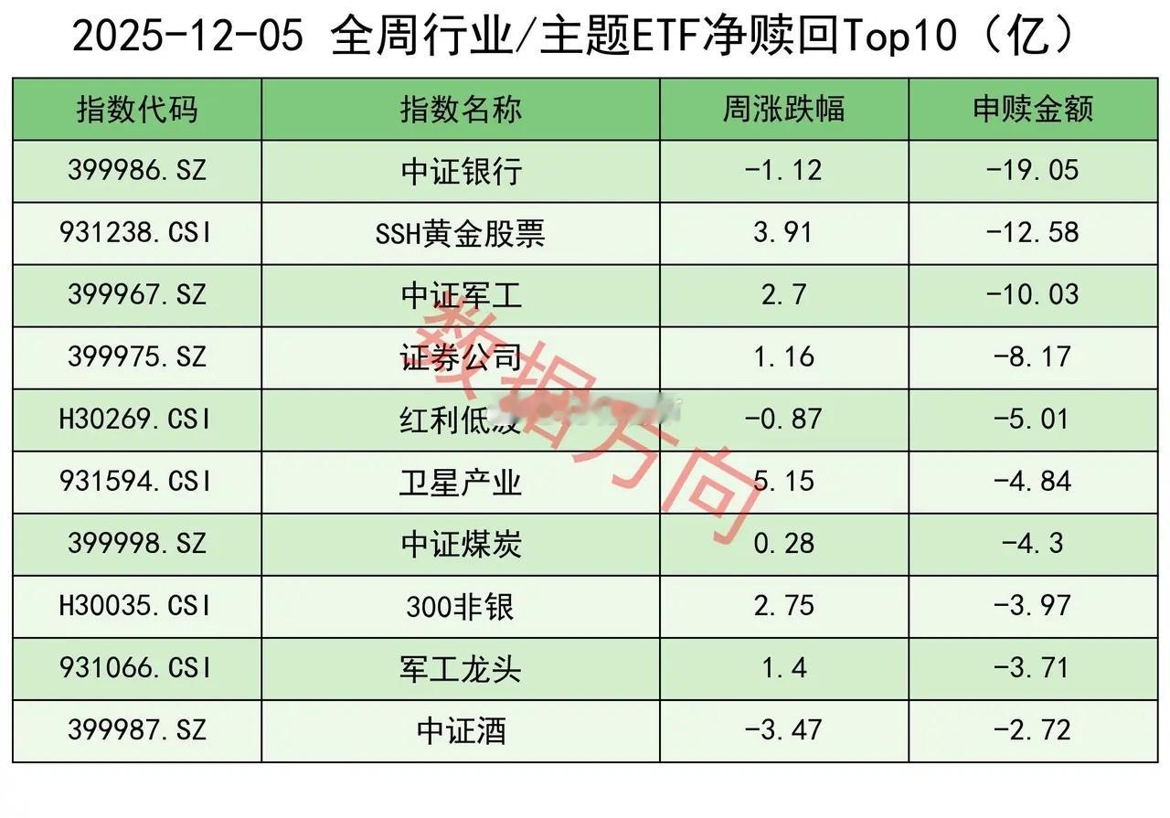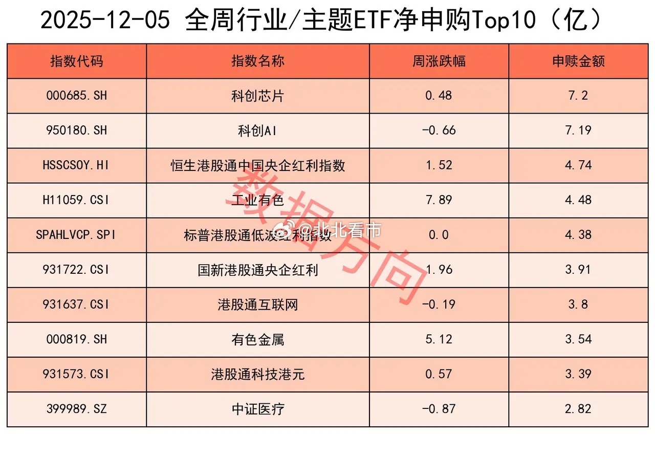 上交所ETF本周净申购37亿本周,上证指数涨幅0.37%,上交所股票型ETF净申购37.34亿。上周一度净赎回234亿,创出9个月以来单周净赎回额的最高金额。好在这种情况没有持续,本周没有继续赎回,转为了净申购。本周五个交易日的净申购、净赎回金额依次分别为:(-71.02亿)、8.88亿、19.93亿、23.83亿、55.72亿。仅在周一净赎回,剩余4天全部净申购。从所有宽指的情况来看:中证A500,本周获36.43亿净申购;科创50、中证500,本周分别获得15.62亿、10.15亿净申购;中证1000、上证180,本周分别获得8.98亿、0.68亿净申购;上证50,本周净赎回13.45亿;上证指数、沪深300、科创100、科创创业50、中证A50,本周分别被小幅净赎回。行业和主题申购榜恒生港股通中国央企经利指数、标普港股通低波红利指数、国新港股通央企红利,一起进入本周申购榜,累计净申购13.03亿;中证银行、红利低波一起进入赎回榜,累计净赎回24.06亿红利高股息方向出现了分化,央国企以净申购为主,银行以净赎回为主(红利低波含银量较高)。本周内,一些前期滞涨的优质蓝筹品种纷纷迎来补涨。起码不是坏事,只有当优质企业通过稳定的现金流、持续的盈利增长与合理的分红回馈,让坚守价值的投资者切实享受到时间复利的红利,才能让更多资金主动拥抱价值投资、扎根长期布局,才能推动市场实现长期健康发展。工业有色、有色金属指数,一起进入本周申购榜,累计净申购8.02亿此两个指数,本周涨幅分别高达7.89%和5.12%,不仅没有引发赎回,反而继续获得净申购。老美降息,世界进入新一轮宽松周期,是推动大宗商品走牛的重要原因。11月6日,老美将白银纳入关键矿产清单,这一举措让白银从普通商品升级为战略资产。市场担忧后续还会继续出台关税壁垒或资源管控措施,于是纷纷展开囤货与套利行为,推动伦敦银现货挤仓。白银还没有翻篇,紧接着伦铜又逼近历史最高价。老美掌控着世界上大部分铜资源,东大是世界上消耗铜最多的国家,细思极恐。赎回榜中证军工、卫星产业、军工龙头,本周合计净赎回18.58亿证券公司、300非银,本周合计净赎回12.14亿