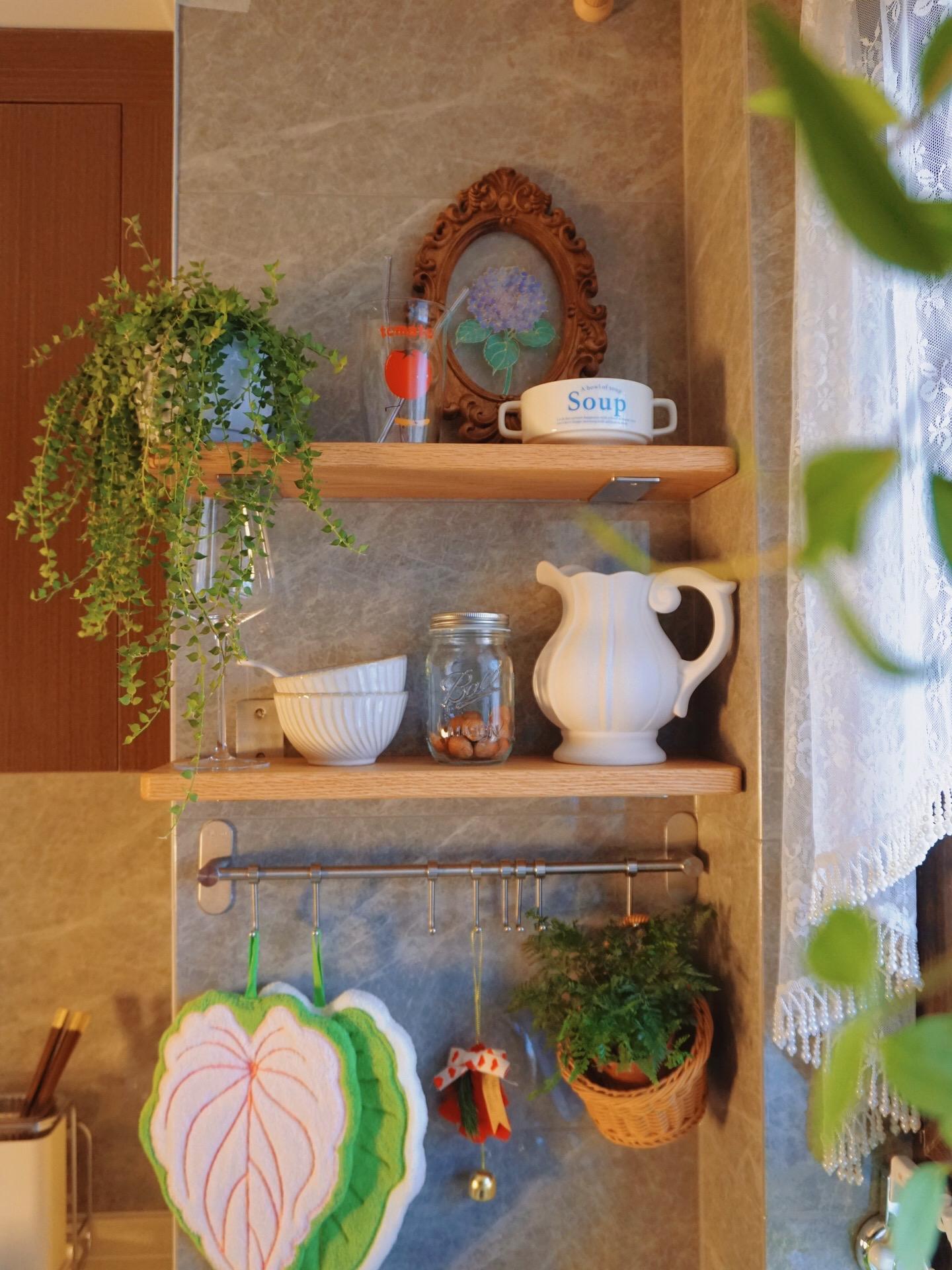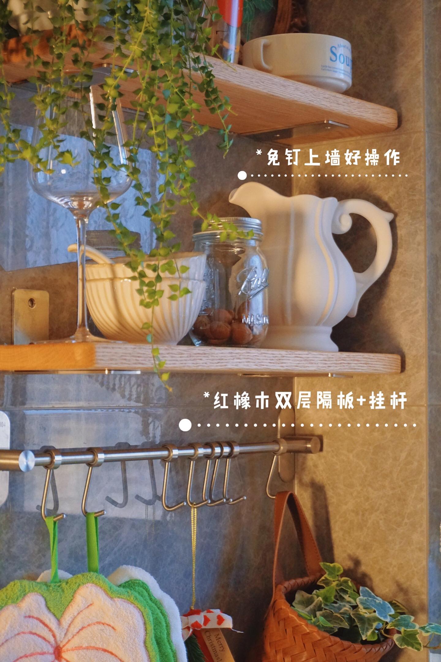 【法式双层实木隔板】红橡木的隔板颜色也很田园,搭配银色不锈钢隔板托,小细节更显精致~