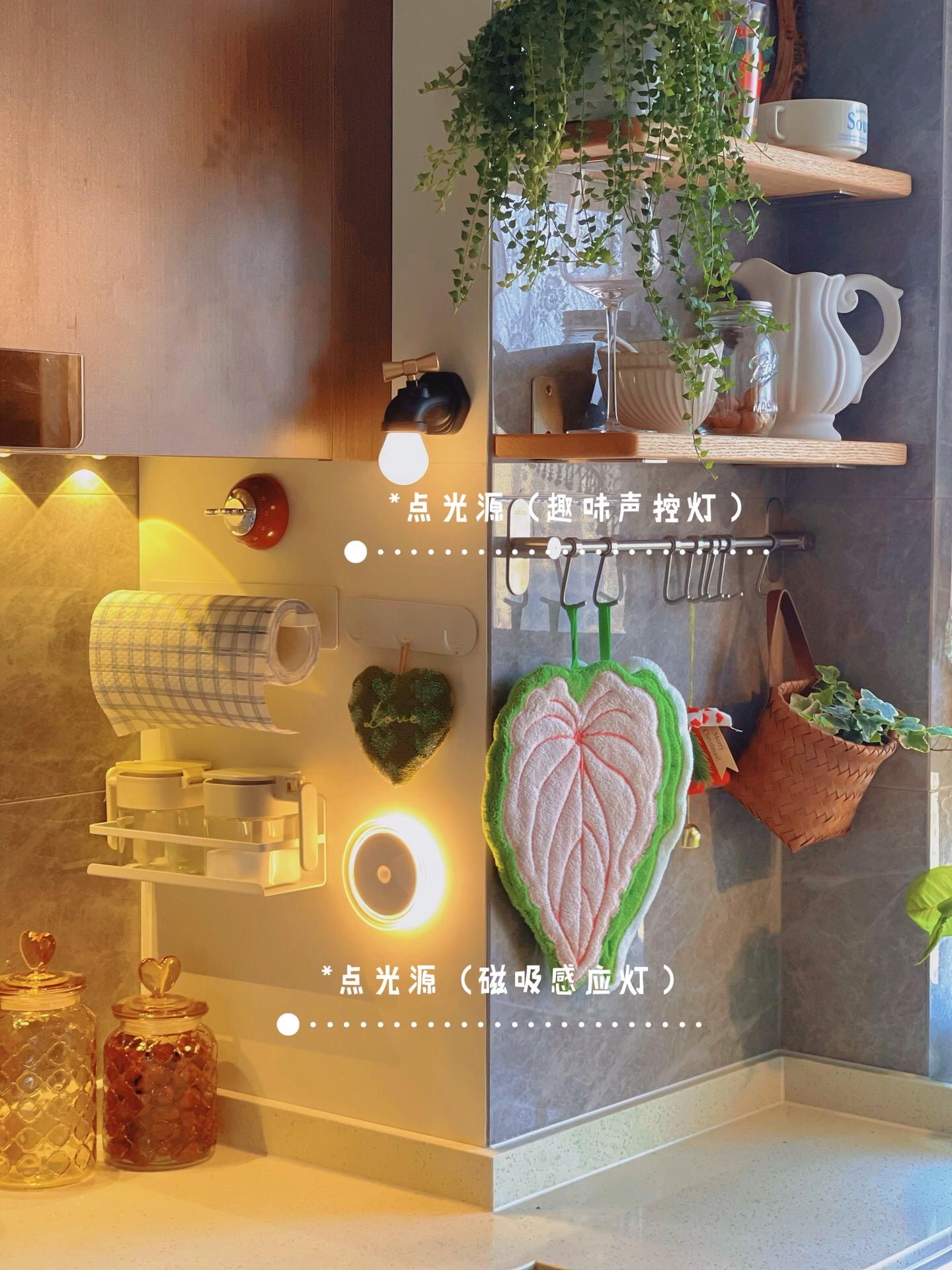 【点光源】增加一些电光源,空间更有氛围,水龙头声控灯,实用又有装饰性。磁吸感应灯,晚上人来即亮,自带磁吸贴,磁吸墙上,不占空间。实木吊灯,插线设计,不用接