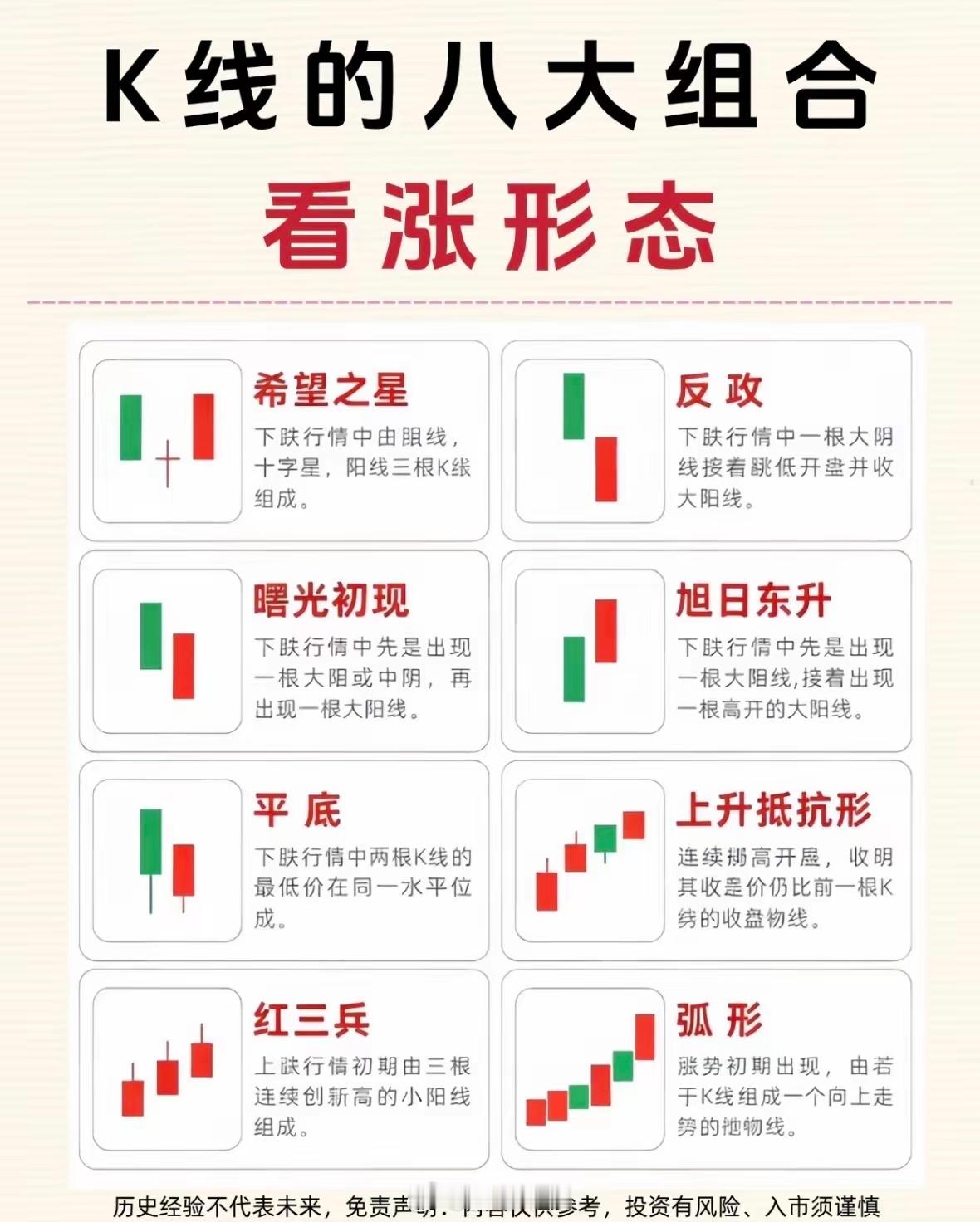 K线八大看涨形态,助你股市投资更得心应手!解析K线看涨形态:曙光初现、红三兵等组合预示反弹,但历史经验仅供参考,投资需谨慎。"