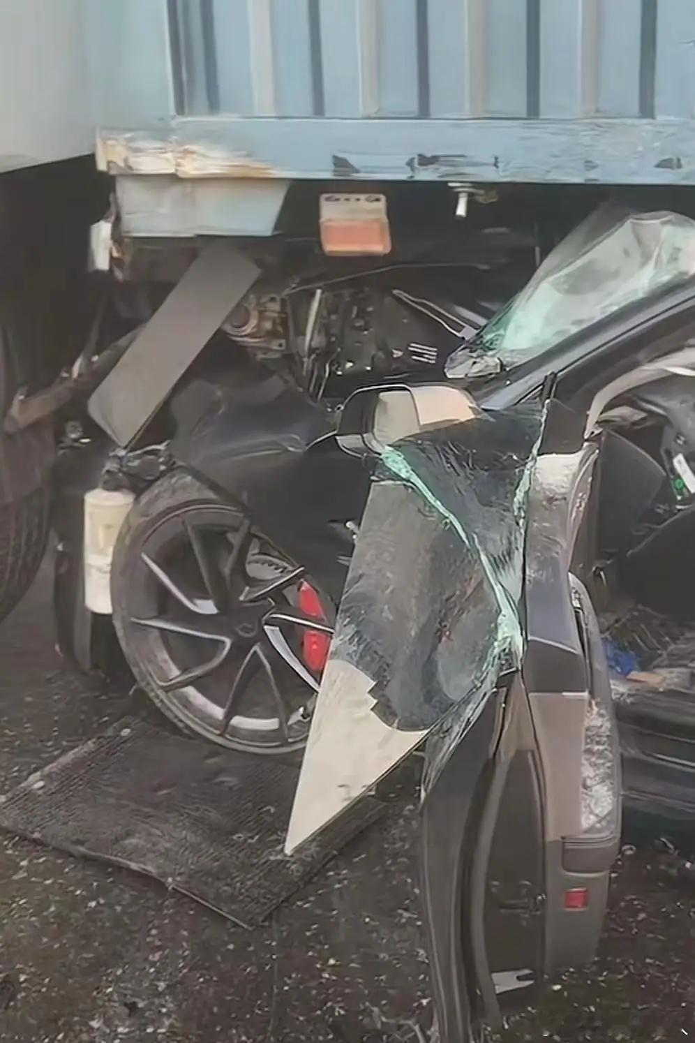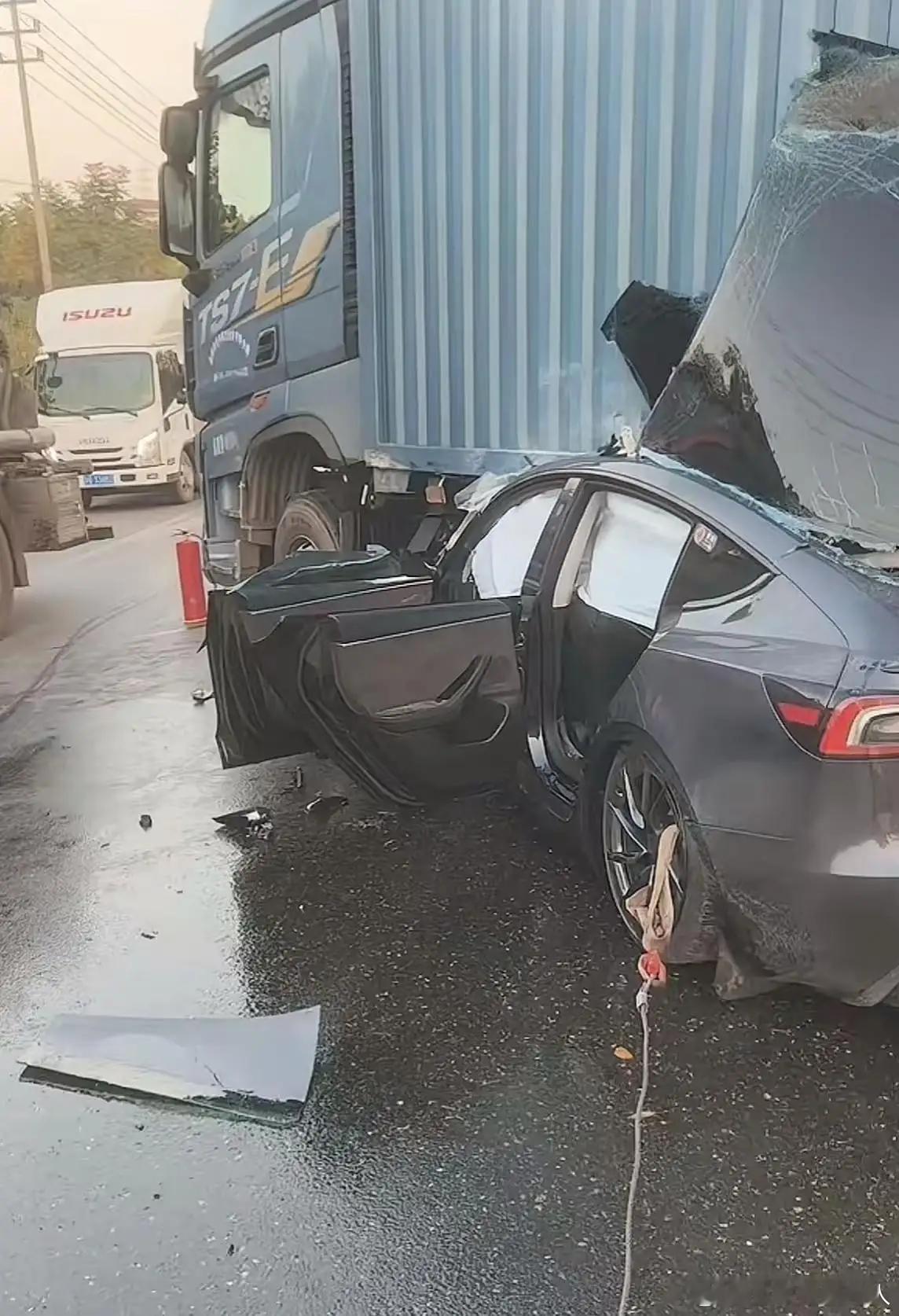 仔细看,特斯拉直接把大货车都顶起来了(原以为车主还在车里,没想到人家已经在特斯拉4S店挑新款了)