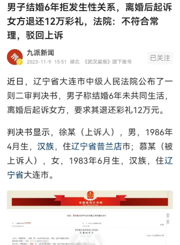 这个结果出来后,网上分成两派,有人觉得徐某六年不履行丈夫义务还好意思要彩礼,也有人认为没有夫妻生活的婚姻确实该退钱。