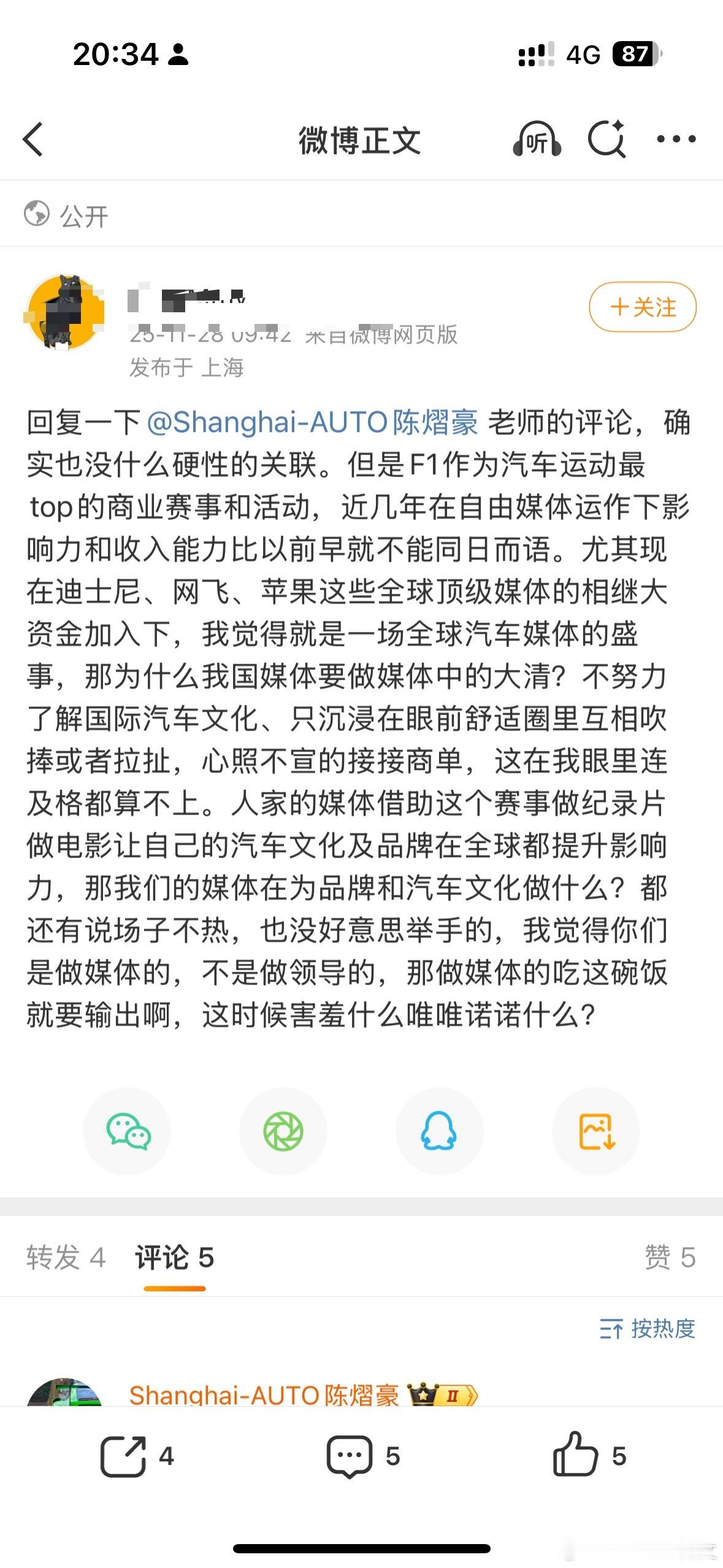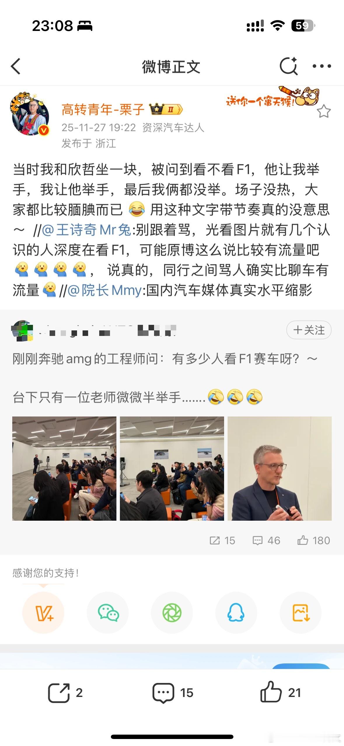借着今晚看F1的收官战聊聊最近我在微博上看到有这样的一个博文,说的是在一个奔驰的新车发布媒体会上,奔驰的一个工程师问了现场所有的一些汽车媒体和博主,有谁平时会看F1赛车的?现场竟然只有一个举手,要知道现场大概有二三十个汽车媒体博主。(当然,后来我喜欢的几个汽车博主说了他们都在现场当中,他们肯定看F1,没有举手的原因是因为现场气氛有些拘束腼腆)然后这件事情就在网上发酵,下面的评论就说现在的汽车媒体,博主都不看这种赛事,什么这就是国内汽车媒体的真实缩影,一点不专业,恰烂饭,厂商的舔狗,甚至上升到道德绑架等等…那我看,这件事情又没有到如此对立的程度,首先我也觉得不看F1的汽车博主其实在国内来说应该还是挺多的,至少不深度看的。但这不代表人家输出的汽车知识和文化,甚至专业性就这么一文不值。因为就我知道的,有些从业偏久的行业大佬和专业车评人他们就很少分享F1的内容,但他们依然在这一行业中得到中肯的认可的。这里肯定有一些原因的,比如说他们认为F1就是一个娱乐赛事,有些无聊,也有一些因为家庭,工作,熬夜等时间问题是根本无法坚持去看的,要知道这是一项全球赛事,虽然都是在周末进行,但时间上也确实不是那么友好。其实我就是这样的原因,所以也达不到一种狂热的追捧,每站必看,只是有些友好的分站会看,比如亚洲地区的。但是每一场分站第二天我都会去关注一下相关赛事结果(和朋友有谈资)但是,其实我更想说的是可以不看直播,但是作为汽车从业者还是得至少时常关注这项赛事。(虽然现在娱乐性比竞技性更强了)但因为F1作为汽车工业上的明珠,也是全世界名副其实的超级赛事,不仅能了解到关于汽车文化,关于最新的汽车技术和行业研究成果的最好呈现方式,它必然有它的魅力所在。那这项运动,对于我们国内汽车工业来说到底有什么参考意义呢?就是可能很多消费者或者用户或者汽车博主,会觉得我们现在中国的新能源发展这么强大这么先进了,而且F1到目前为止还是属于一个比较集中于体现燃油发动机技术的一个集大成之作。我们也不会在燃油这个领域有多大的参考意义。所以这就是得关注这项赛事的原因,你要知道就最近几年这个F1规则下,最新的赛车都是在越来越依赖于电气化的一个技术。特别是明年开始,不仅全面采用有机可再生燃油,而且对于电气化更加体现在赛车的技术开发上。最明显的例子就是看到就是比如说厂商的法拉利、奔驰,比如说明年的奥迪,他们都会在这项赛事就是投入大量的人员、技术、资金去研发创新这个电气化架构,电气化技术,然后把技术的下放到他们的民用车上。可能你还不相信了,就觉得我们现在目前国内的新能源发展的这么好,证明我们是不是在电气化或者能源方式里面已经非常的厉害了。其实我想说的就是我们不要妄自菲薄,也不要盲目的自信,觉得就是西方特别欧洲那边的新能源发展的比我们落后或者干嘛,其实他们也许并不是落后,而是一些国家政策导致的一些推迟也好,或者什么也好,反正你起码从F1这项赛事来说,他们在电气化架构,在电动领域,特别现在的FE电动方程式赛事上,也足够证明他们在这方面的技术储备是非常的充足的。所以如果他们一旦把这个东西把这个技术下放到他们的民用车上,那么我们国内的这些新能源车我只能说会非常的有压力。从最近BBA里的新车、概念车的一些发布,比如说奔驰XXX、电动CLE,还有宝马快要发布的新世代的iX3,电动M3,奥迪的一些电动车等等这些都足以代表他们在本来的领域,豪华底蕴,底盘,空气动力学等方面已经非常具有优势的情况下,他们在电动化时代也能做出一些非常令人惊艳的一些产品就足以说明他们开始发力了。就目前来说,虽然我们国内强大的供应商和零部件市场,以及软件开发、AI、价格等领域依然是我们最大的发展优势,但这些并不能成为我们未来的护城河。毕竟汽车工业的发展,是离不开关于汽车文化,架构,底盘调教,耐久性,稳定性,空气动力学,汽车赛事,甚至赛车手培养等综合方面的经验积累。我们作为相关从业者,不仅仅起到传播和连接的作用,更加要有忧患意识,不盲目自信崇拜,要有一定的责任感,增加基础理论知识,参与相关赛事文化传播交流,这才是我们该自信的地方。以上仅代表我个人的看法!汽场全开