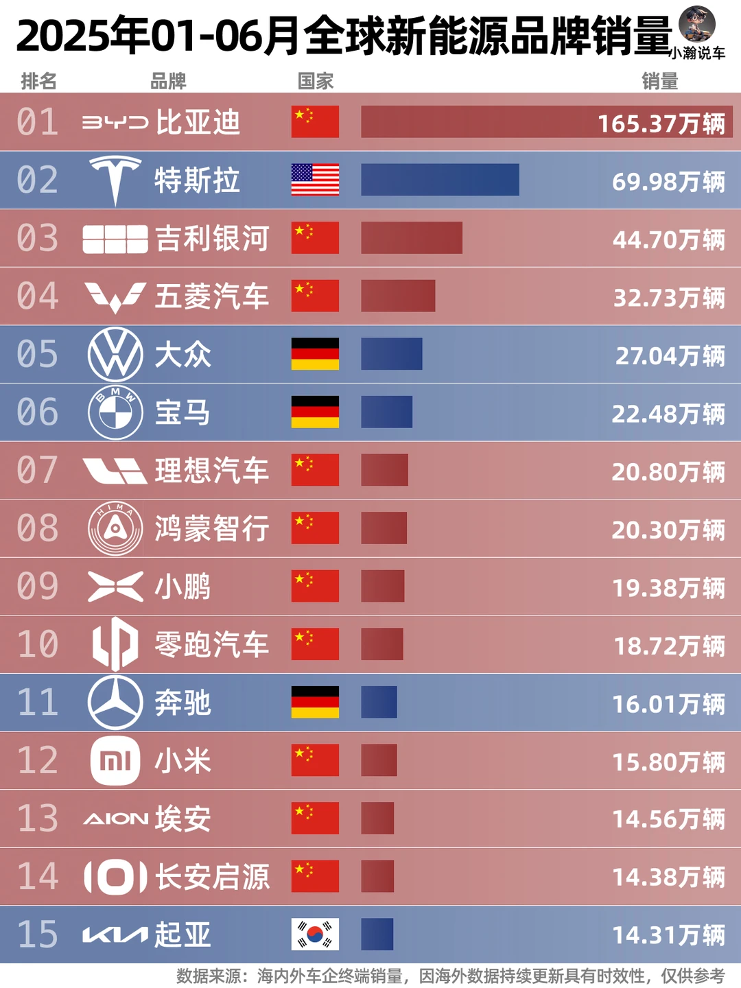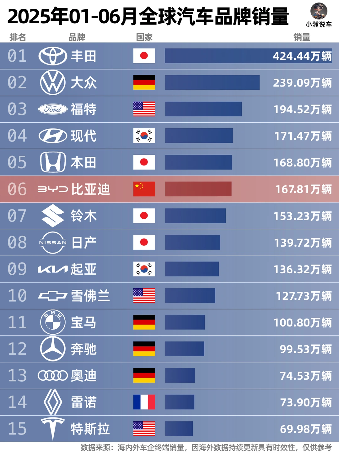 🌟总榜上:丰田、大众稳守冠亚军席位,ling先优势稳固。比亚迪凭借6月国内市场的一波降价,总销量一举超越福特跃居全球第三!全年累计销量同步升至第六位。若保持此增速,你看好比亚迪今年年末单月销量超越大众吗?