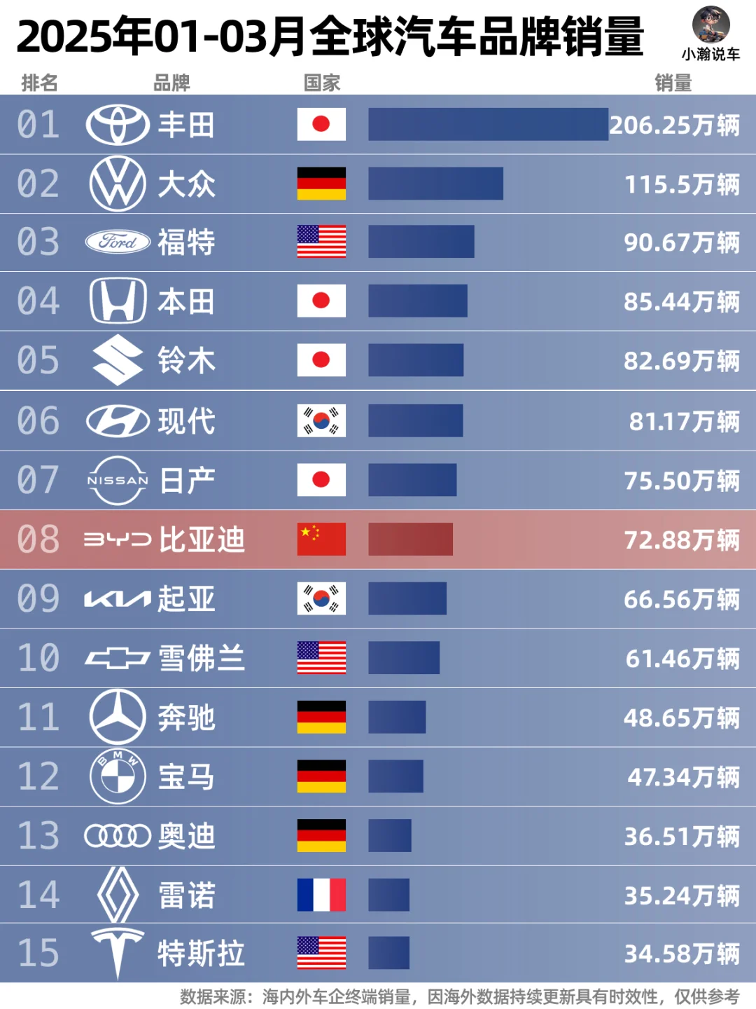 丰田大众福特依然包揽Top3,尤其是丰田大众的份额依旧依旧稳固,并未受中国市场的影响。比亚迪在国内发布“全民智驾”后销量大幅回升,海外出口也已经连续3个月破6万!照这个势头,你觉得今年比亚迪全年销量能冲进全球前三吗?