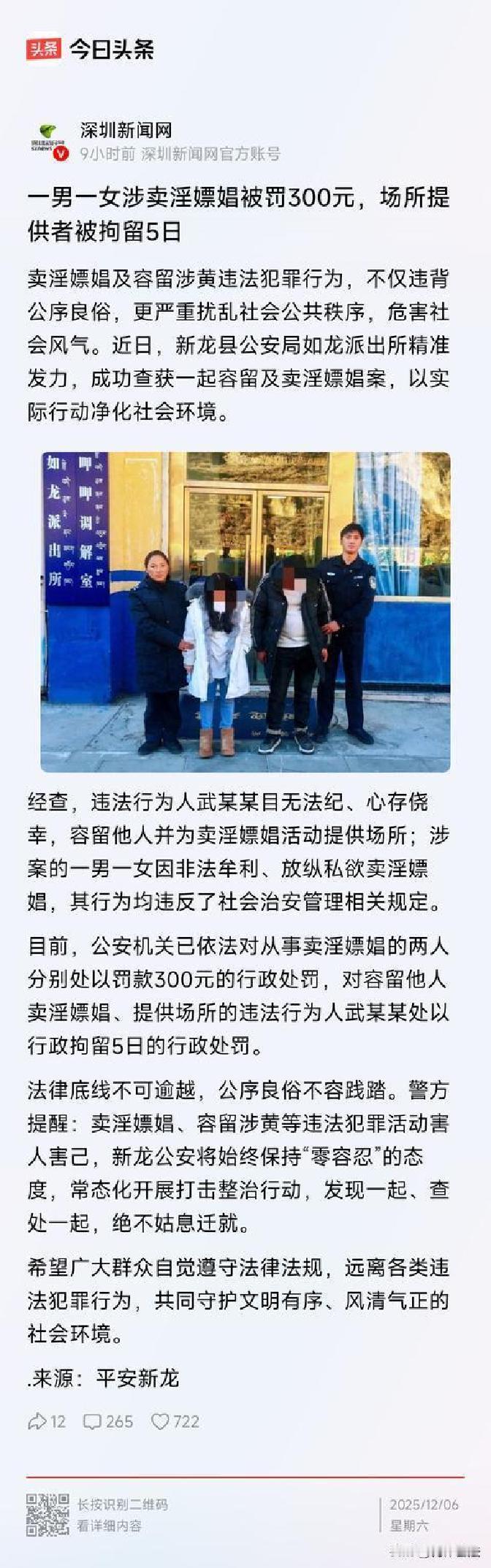 四川甘孜新龙县,最近警方出击,端掉一个藏在角落里的小窝点。一对男女刚聊上价码,还没来得及动手,就被如龙派出所的民警逮个正着。结果呢?俩人各挨了300块罚单,干干净净的教育一顿。提供地儿的那个武某某更倒霉,蹲了5天号子,还搭上300块罚款。这事儿一出,立马让人琢磨:罚这么点,够震慑吗? 法律这儿有讲究。根据最新治安管理处罚法,卖淫嫖娼这事儿,正常得关10到15天,还能扣5000块以内。但要是情节浅,比如刚谈成没真干,或者头一回犯事儿、态度老实,就轻拿轻放,5天以下关押或500块封顶罚。甘孜这案子,估计就卡在“浅水区”——没酿大祸,罚300正合适。不是省事儿,是过罚相当的原则在起作用,教育为主,防患未然。要是真闹大,刑法等着呢,最高关五年加罚金。 再说提供场所的,法律眼里这是毒瘤源头。第67条明摆着,容留介绍卖淫,轻的也得5天关或500罚,重了直接上刑。武某某这回没超线,才行政处理,但零容忍的信号亮堂堂。数据显示,全国去年这类窝点破获超万起,早打早止,社会风气稳多了。 举报这块儿,也得说清。各地奖励有谱,一般治安案200到1000块,刑事大案能上万,但别把婚外情啥的道德事儿当违法报,那不靠谱。法律管违法,不插手私德。总的这案子处理利索,体现了法治温度:小错敲打,大祸堵嘴。守规矩,才是真聪明
