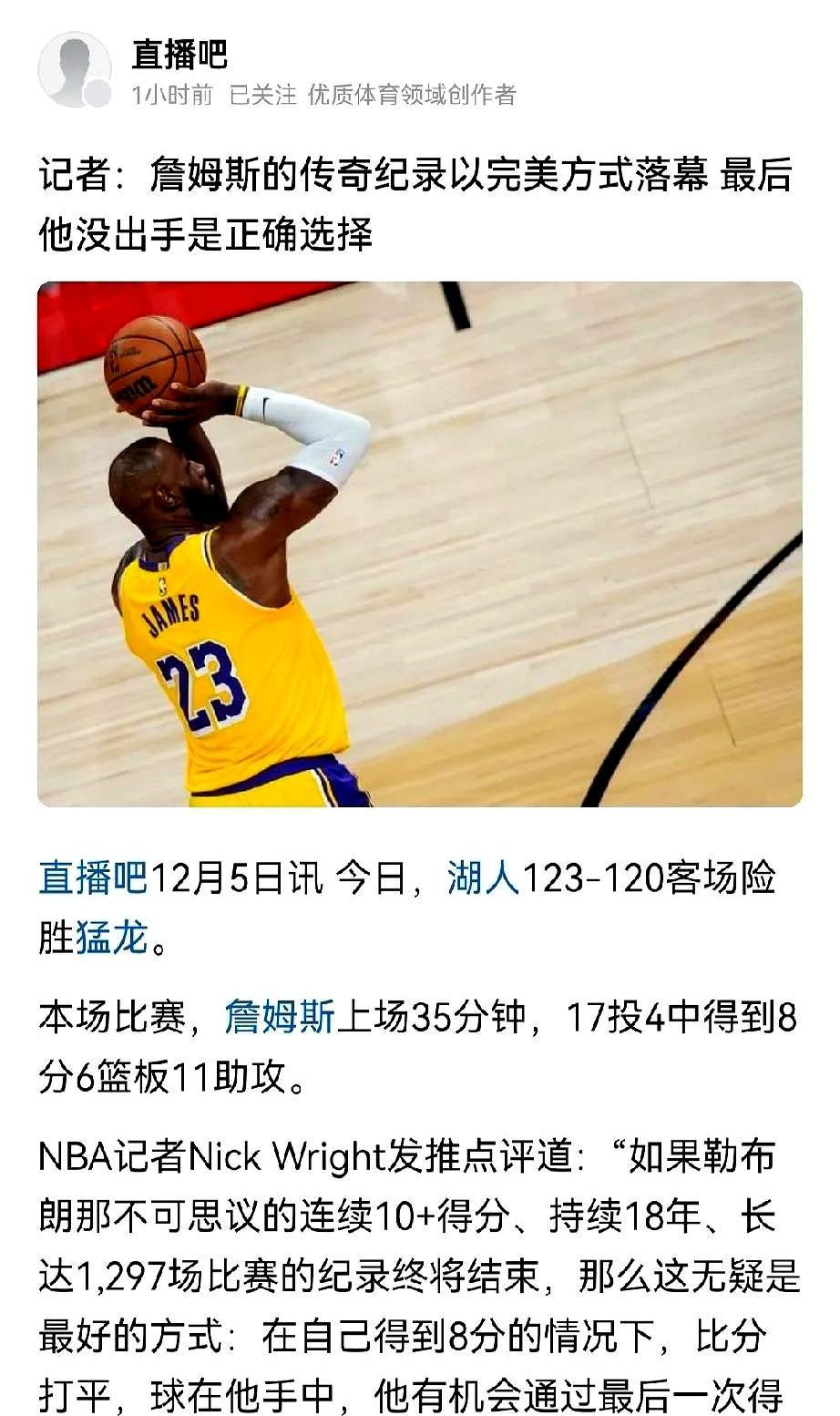 最后两秒,他没选分数。 他把球传给了空位的队友。 1297场的连双,就这样停在了8分外。 39岁的人,能顶住诱惑的不多。 哈姆赛后说,是詹姆斯自己在暂停里喊的——包夹就传人。 这赛季第9次最后30秒致胜助攻,联盟第一。 雷吉说这才是真GOAT时刻。 官方都发了那帧,配文“伟大的定义”。 视频破1800万次播放。 有人把这看作纪录的断裂。 我看这是优先级的升级。 像大排档里老兄把最后一块肉推给后辈,自己少吃一口,却换来一桌人的脸上笑。 湖人稳住第九,和第八只差1.5场,胜利传染力比数据更值钱。 真正的厉害,不是你能坚持多少纪录, 而是在关键时刻,知道该把荣耀分给谁。
