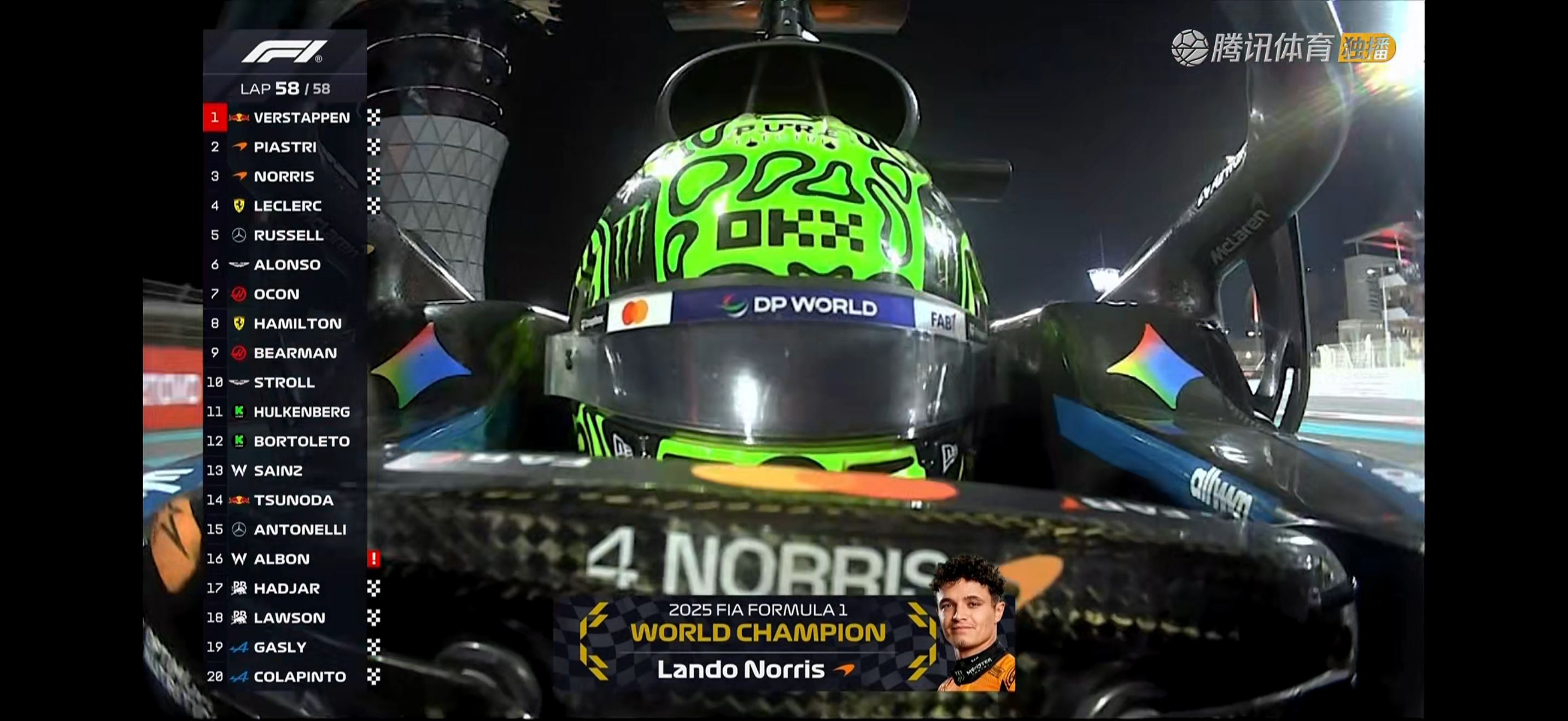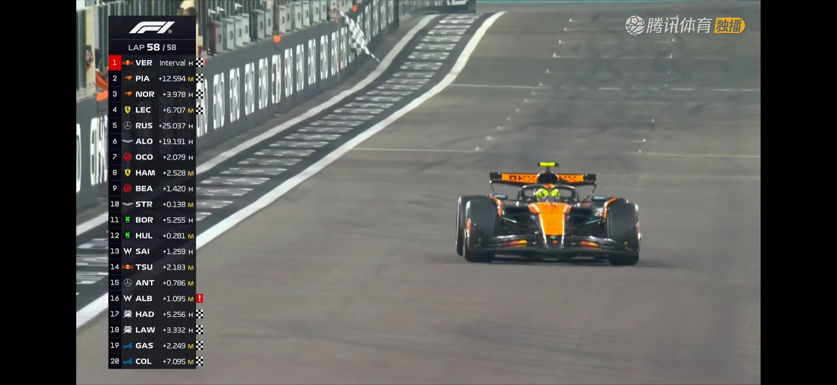 恭喜诺里斯拿到车手总冠军!夏休之前诺里斯被皮亚斯特里压着打,完全没有冠军相。荷兰站之后,诺里斯落后皮亚斯特里 34 分,有很多人认定今年的总冠军是皮亚斯特里的了。诺里斯能拿车手总冠军,真的是靠意志力,不放弃希望,一场一场顶过来的,非常不容易!竞技体育鼓舞人的,不只是更高、更快、更强,还有车手永不言败的精神。