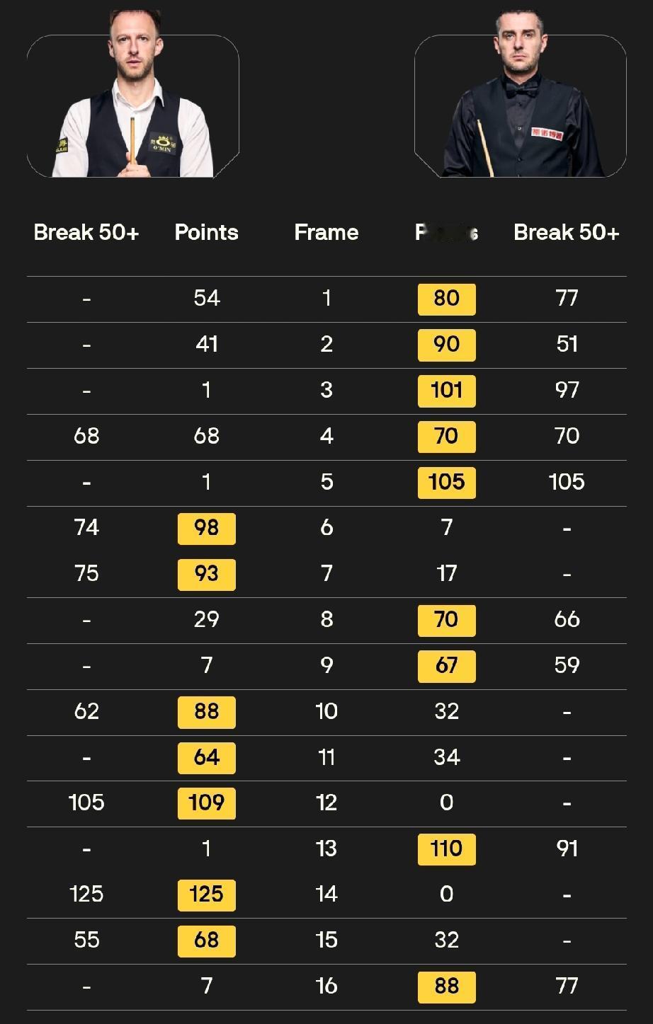 9-7 12月8日清晨,2025斯诺克英锦赛决赛已经战罢16局,马克·塞尔比9-7暂时领先贾德·特鲁姆普! 第一阶段八局比赛,马克·塞尔比发挥极为出色,先赢五局,5-0领先!随后,贾德·特鲁姆普扳回两局,第八局,塞尔比胜出,以6-2的比分领先特鲁姆普结束第一阶段比赛。 第二阶段前8局比赛,特鲁姆普打出两杆破百,5-3领先塞尔比。在两个阶段已经结束的16局比赛中,马克·塞尔比9-7领先贾德·特鲁姆普来到赛点。