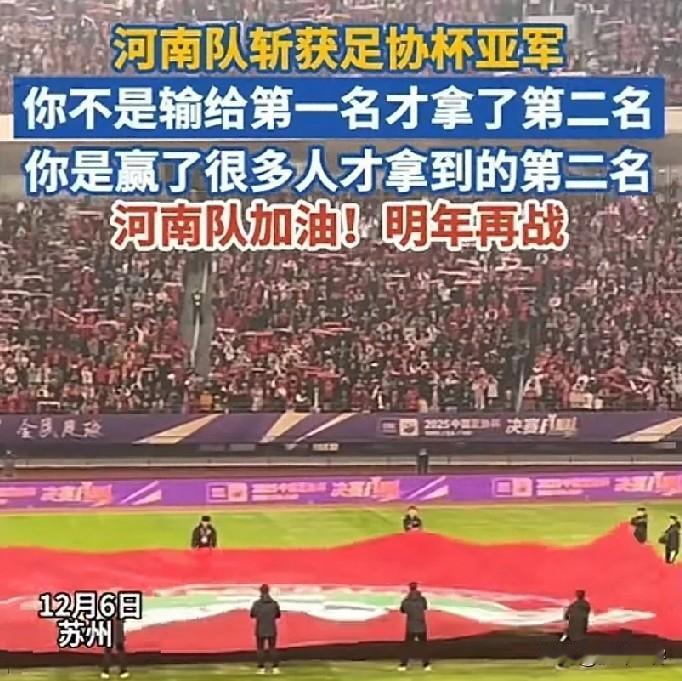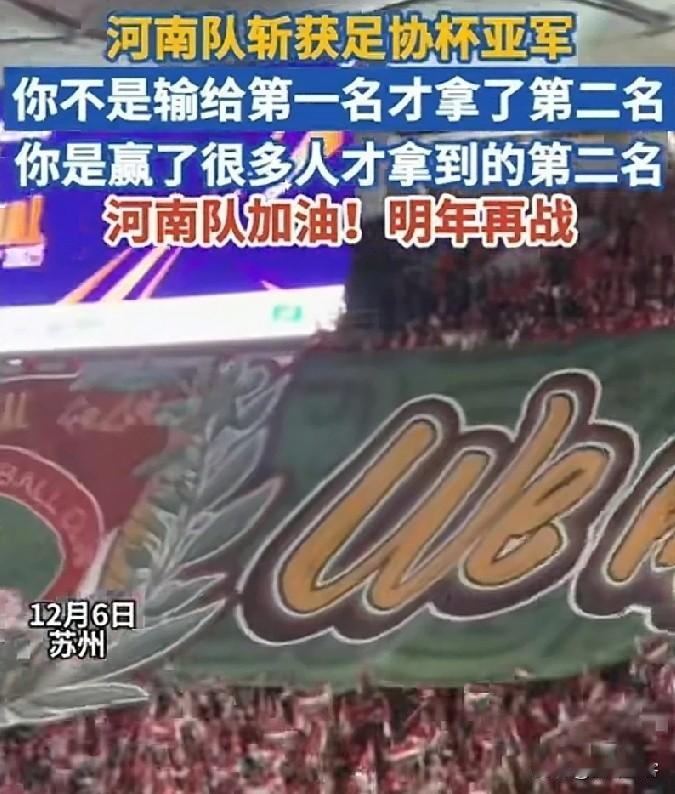 我觉得这位球迷总结的很对:河南队 不是输给第一名才拿到第二名,而是赢了很多人才拿到第二名! 其实在足协杯与浙江的赛前,有很多人就不看好中原军团,因为届时的河南队正处以保级的关键时刻,如果选择战略性放弃也未尝不可,毕竟只要能保级成功,球队就能健康的活下去,而之前就有这样的范例,2023赛季大连人在谢晖的带领下打进四强,但是最终却降到了中甲并走上了解散的结局,然而河南队却义无反顾全主力出战拿下浙江杀进八强。 到了1/4决赛他们面对的是夺冠球队上海申花,这时候的河南队仍然可以做出战略性放弃,但坚韧是中原军团依然义无反顾的选择了“血拼”,最终在在点球大战中胜出,接下来在凤凰山他们又一举淘汰蓉城杀进了决赛,创造了队史的奇迹,同时也成为中小俱乐部的典范。 要知道河南队所处的半区强手如林,估计在开打前任何人都不会想到他们会杀出重围进入决赛。 虽然最后未能捧杯,但是河南队可以昂首挺胸的走出赛场,因为在这次足协杯之旅中,他们其实并没有失败,而是向大家展现出了自己的坚韧、顽强和不屈![作揖][作揖][作揖]