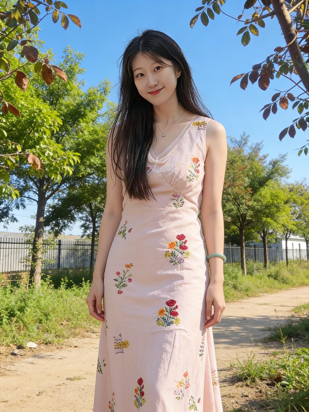 她把春天缝进裙边,第一针是菜地的新绿 浅粉的底布上,花簇开得漫不经心 像田埂边自开自落的小野花,带着泥土的呼吸 阳光斜斜切过山峦,在她发梢缀上碎金 ~ 第二针,缝上商场的霓虹碎屑 冷光擦过碎花,却没磨掉花瓣的软 货架的金属冷意,抵不过裙上草木的温 她站在人流里,像一株移栽的春,根仍扎在山野 ~ 第三针,是林间土路的槐花香 树影筛下的光斑,在裙上叠成斑驳的章 皮包的棕是秋的焦糖,坠着的绒饰是冬的软糖 她的脚步轻踩,惊起叶下蛰伏的春响 ~ 第四针,缝住村落的炊烟淡影 白墙前的蓝裙,漾着晴空的模样 马尾束起的,是未散的山野风 指尖碰着包带,像碰着一截温软的春光 ~ 第五针,是溪涧的波纹,是云的絮 她走过的地方,都落了半分春的絮语 浅粉裙是温婉的春,蓝花裙是鲜活的夏 而她站在四季的缝隙里,把日常走成了诗 ~ 春日的标本从不是凝固的花与叶 是她带着山野的风,都市的光,乡野的暖 在不同的风景里,开成流动的春 裙摆扫过的每一寸土地,都生了温柔的根