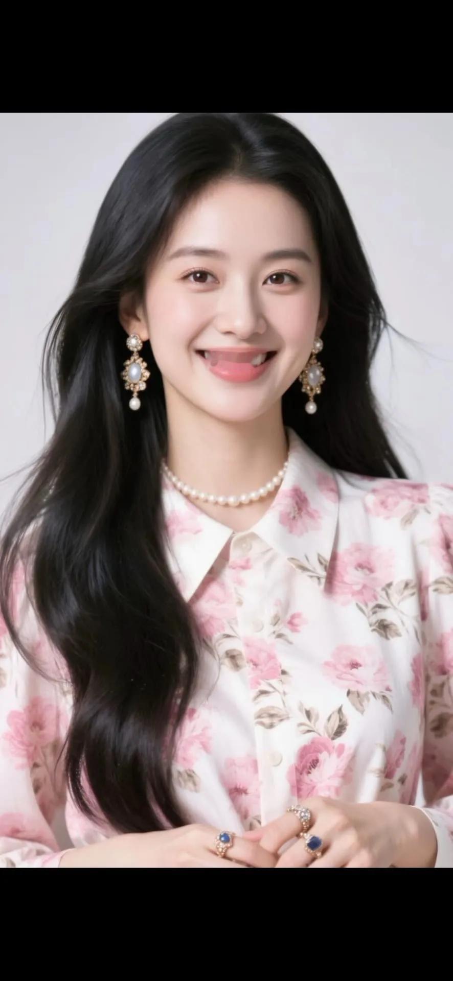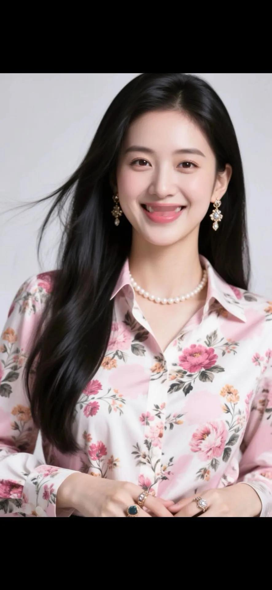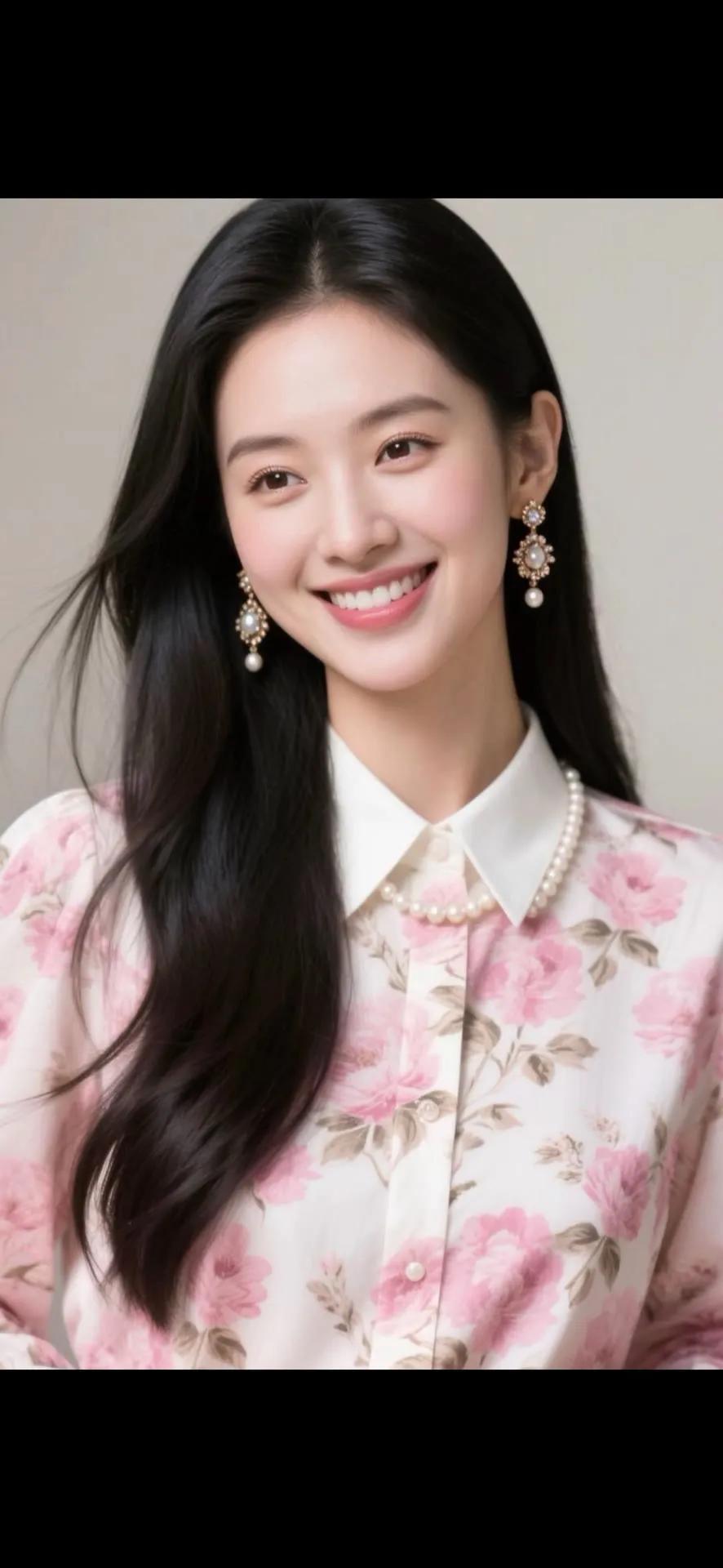 温柔甜美的粉色花衬衫,搭配珍珠项链和耳环,散发着优雅的气质。