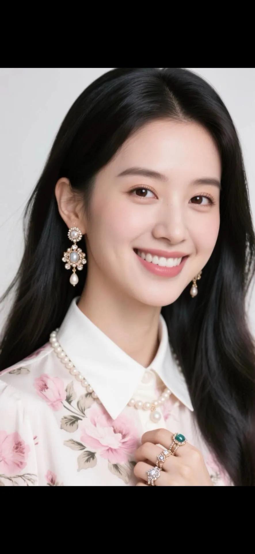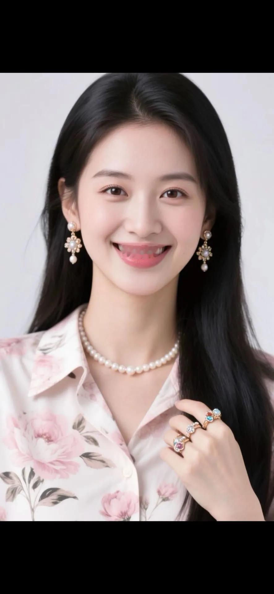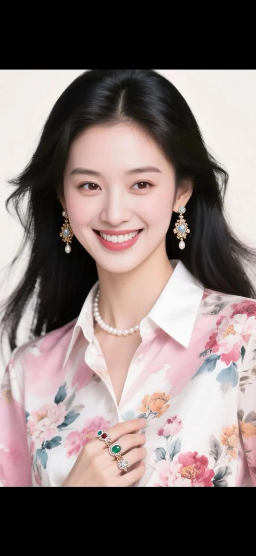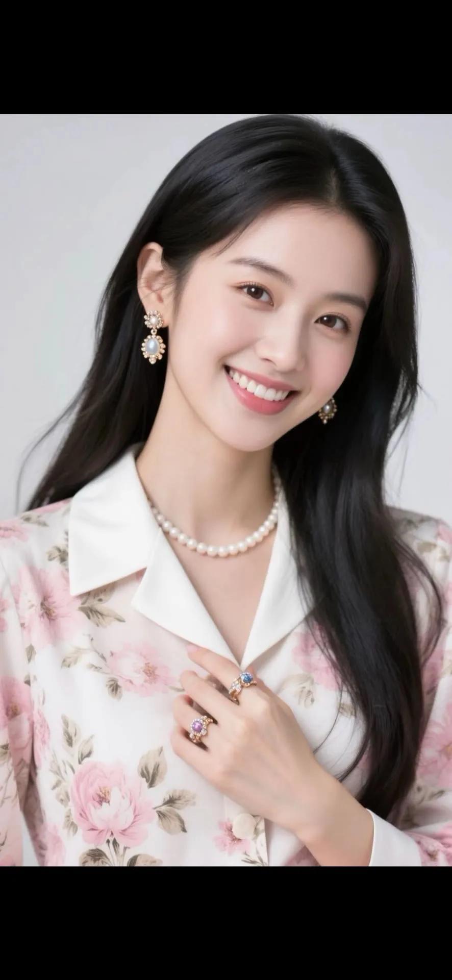 温柔甜美的粉色花衬衫,搭配珍珠项链和耳环,散发着优雅的气质。