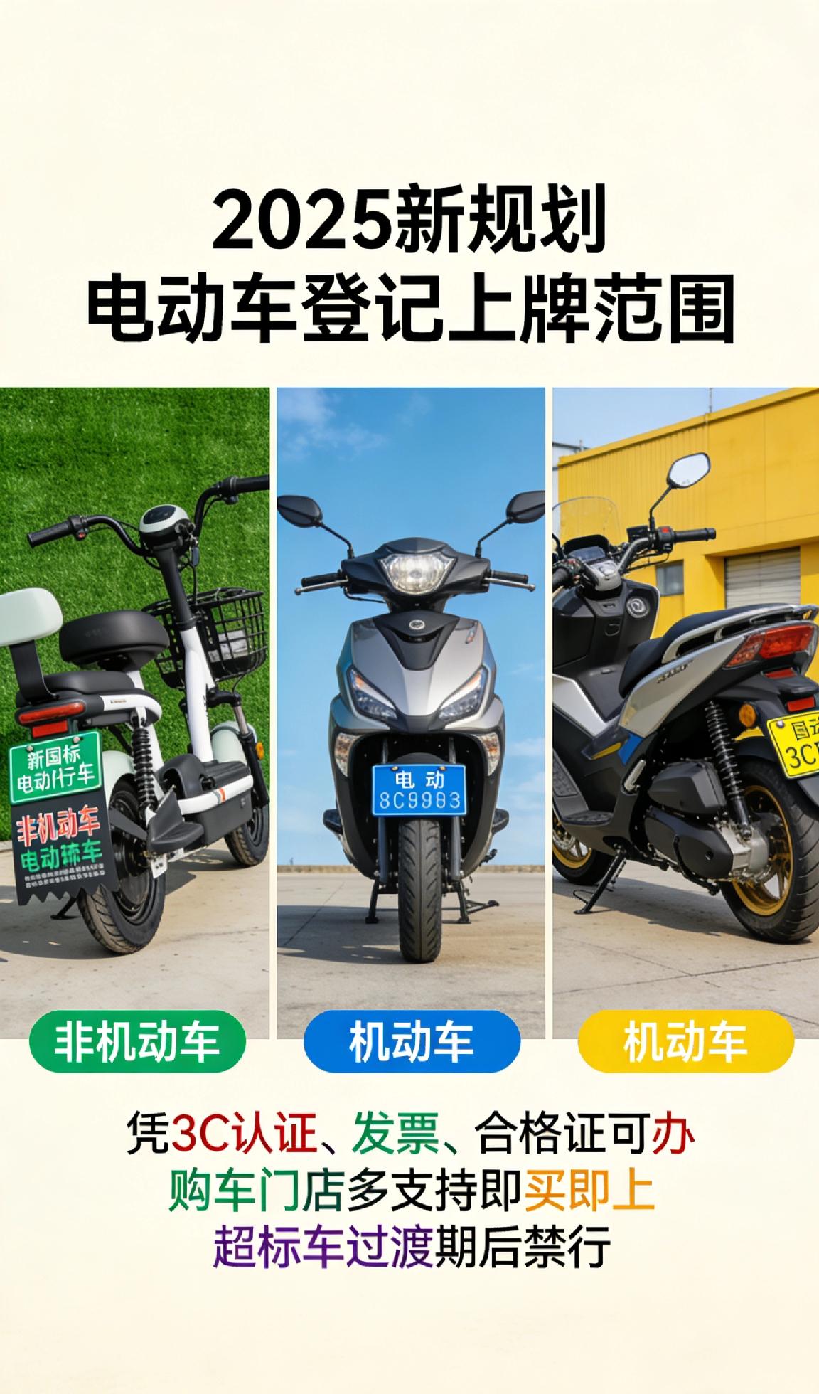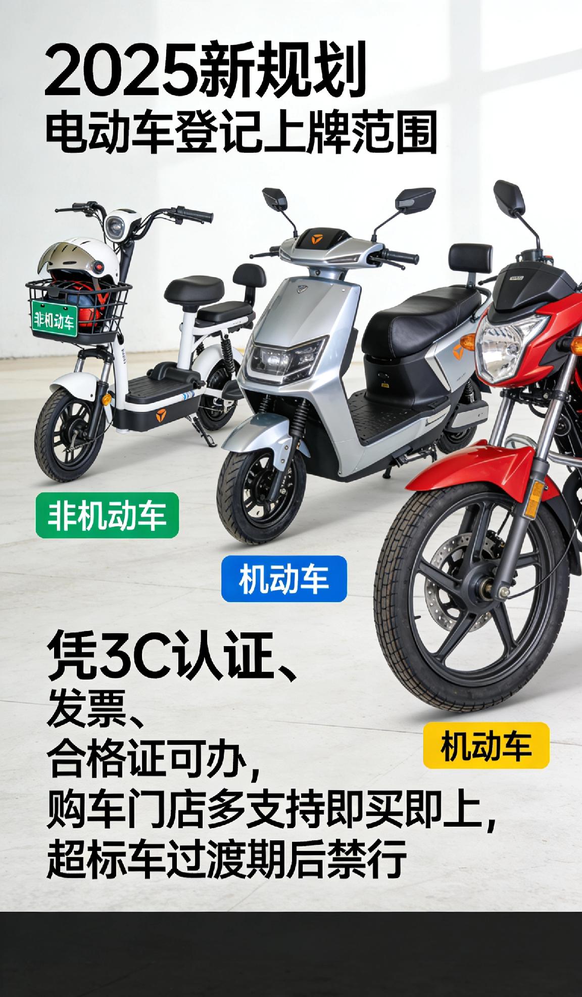 哪些电动车属于登记上牌的范围? 2025新规划重点!三类电动车必上牌才合规👇 ✅ 新国标电动自行车→绿牌(非机动车) ✅ 电动轻便摩托车→蓝牌(机动车) ✅ 电动摩托车→黄牌(机动车) 凭3C认证、发票、合格证可办,购车门店多支持即买即上。超标车过渡期后禁行,合规骑行更安心~ (个人观点,仅供参考) 电动车上牌指南 2025交通新规