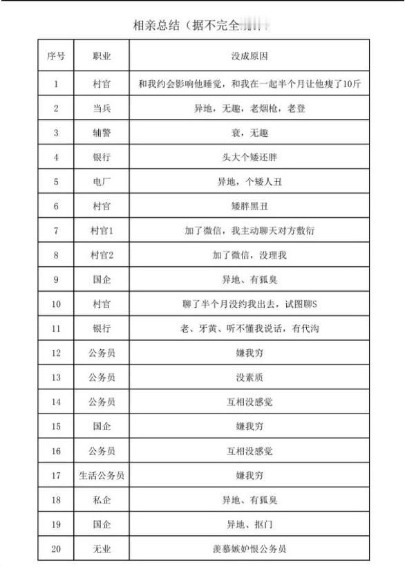 广东,女性网友发文吐槽:再过一个多月又要回老家相亲了,真的被父母催的没招了。在线相亲…… 据这位美女自述,他老家是湖北,97年生人,身高158,体重90,收入7-8k。每次回家过年都被父母逼着去相亲,这些年最起码相了有20多个了。美女还大致的统计了一下她这些年相过的男的大概情况和分析了没有成的原因。 可能他父亲是在镇政府上班的原因吧,20个相亲对象里面有5个是村官。 网友吐槽:我的天,全是对方问题,自己没有任何问题!有三个嫌她穷的,实际上也是她的问题![捂脸][捂脸][捂脸]