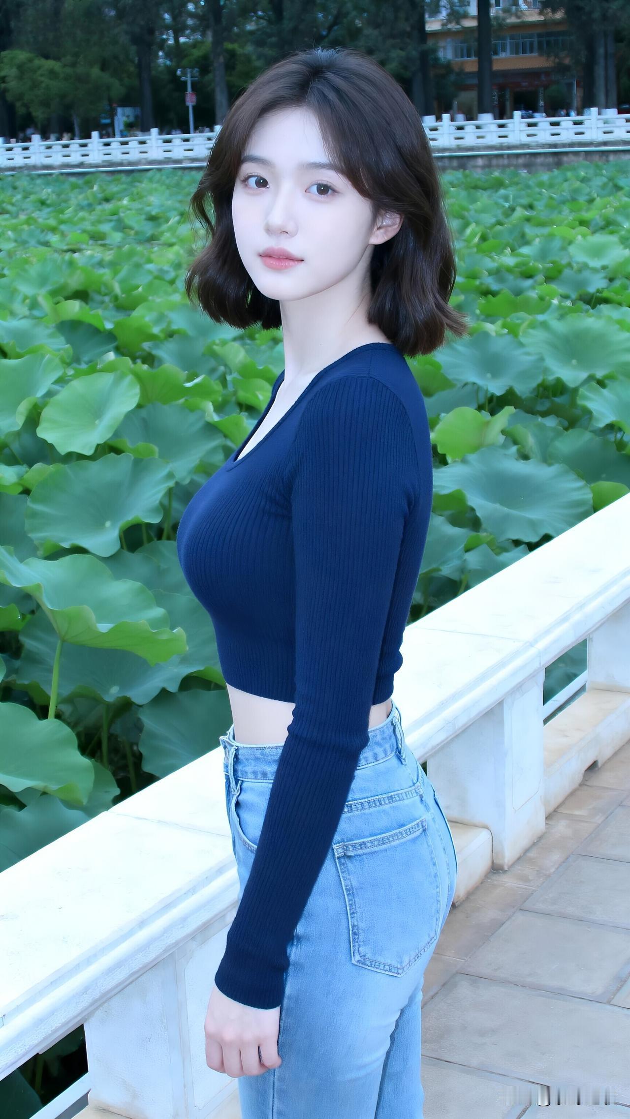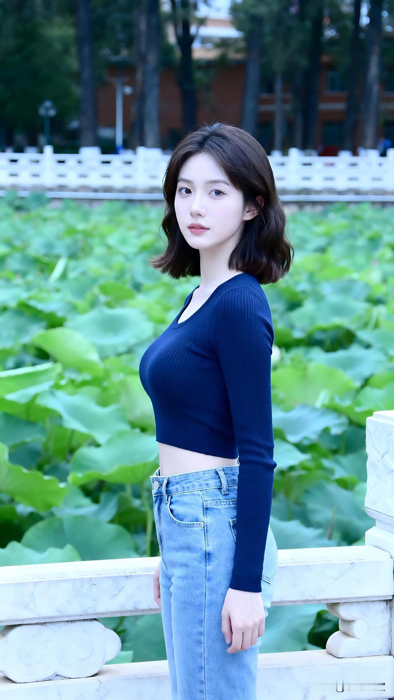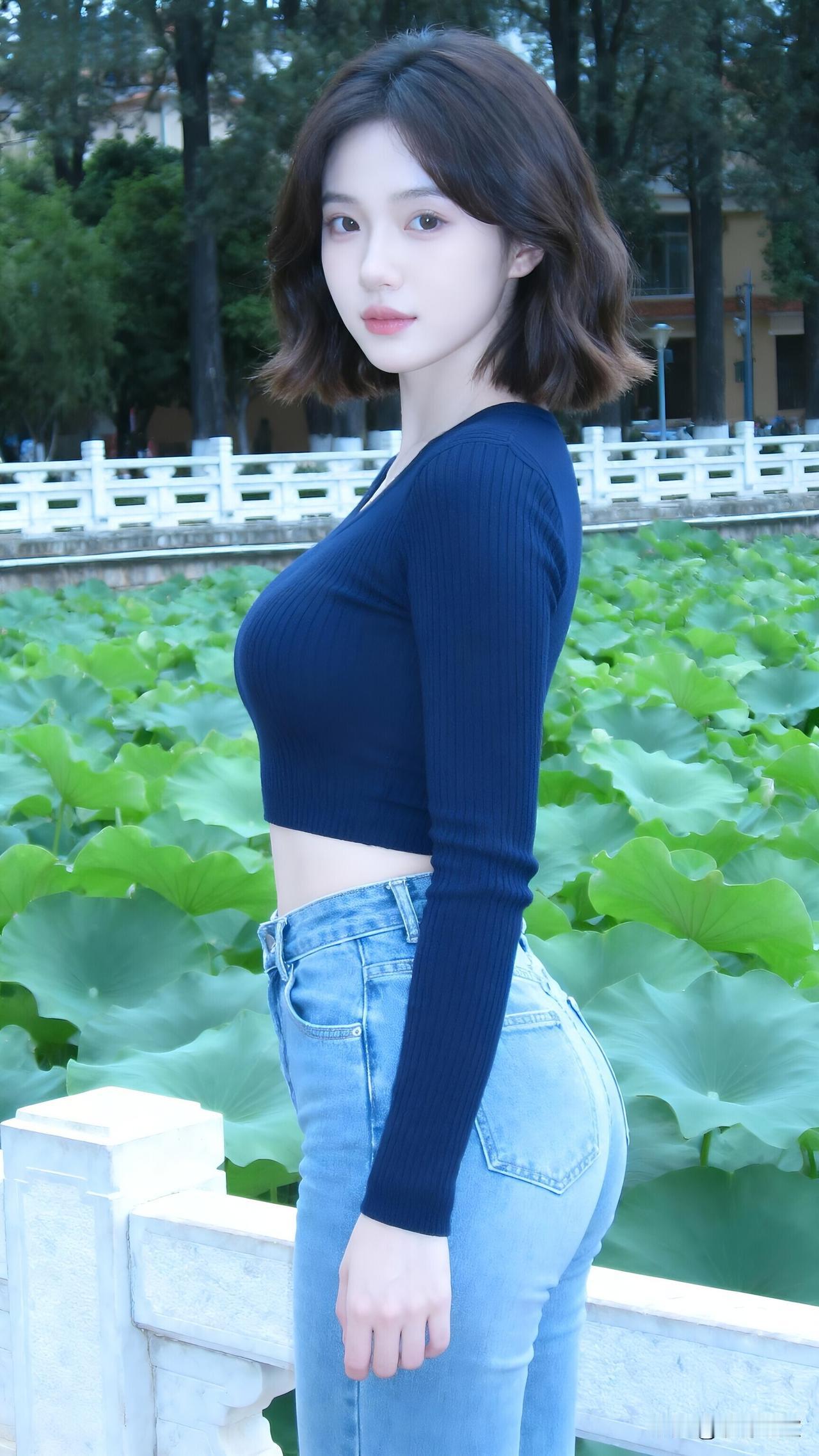 《荷塘倩影》 深蓝针织映碧荷, 浅蓝牛仔裤脚轻。 齐肩短发随风舞, 石栏斜倚笑意盈。 翠叶连天铺绿毯, 白栏横卧似琴筝。 荷塘深处藏幽梦, 一抹温柔醉晚晴。 --- 赏析 此诗以荷塘为背景,将深蓝针织的时尚与自然绿意巧妙融合。通过"翠叶连天铺绿毯"的意象,展现荷塘的生机盎然,"一抹温柔醉晚晴"点出画面温婉优雅的氛围,充满夏日诗意。