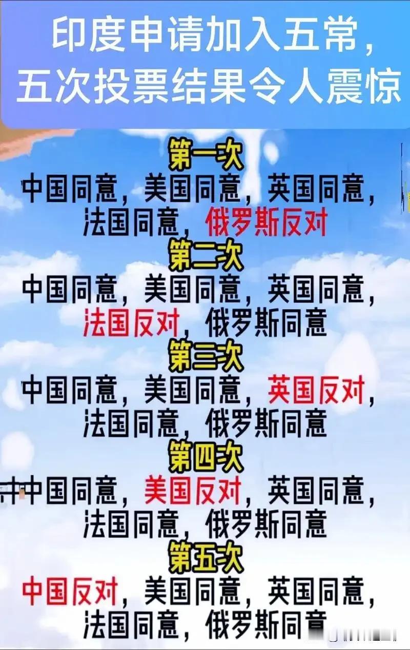 碰、碰、碰、碰、碰 你说这事搞笑不搞笑! 印度入常五次全碰壁,五常轮流“卡脖子”太魔幻! 印度申请加入五常这事简直比电视剧还抓马!连续五次投票结果看呆全网,每次都差最后一口气,五常轮流反对太绝了! 第一次俄罗斯say no❌,第二次法国突然摆手🙅♀️,第三次英国直接摇头👋,第四次美国突然变卦🚫,第五次咱们中国举手反对🙋♀️。网友评论:这哪是投票啊,分明是五常轮流给印度“上一课”! 最绝的是每次都是四票同意一票反对,完美避开所有可能!网友辣评:“五常:这位置是你想来就能来的?”“印度:我太难了,到底谁是我的‘真命天子’?” 不过话说回来,五常机制本身就有“一票否决权”,想加入可不是简单凑数。印度这波操作虽然喜剧效果拉满,但也让大家看清了国际博弈的门道。你们觉得印度下次还有机会吗?😂