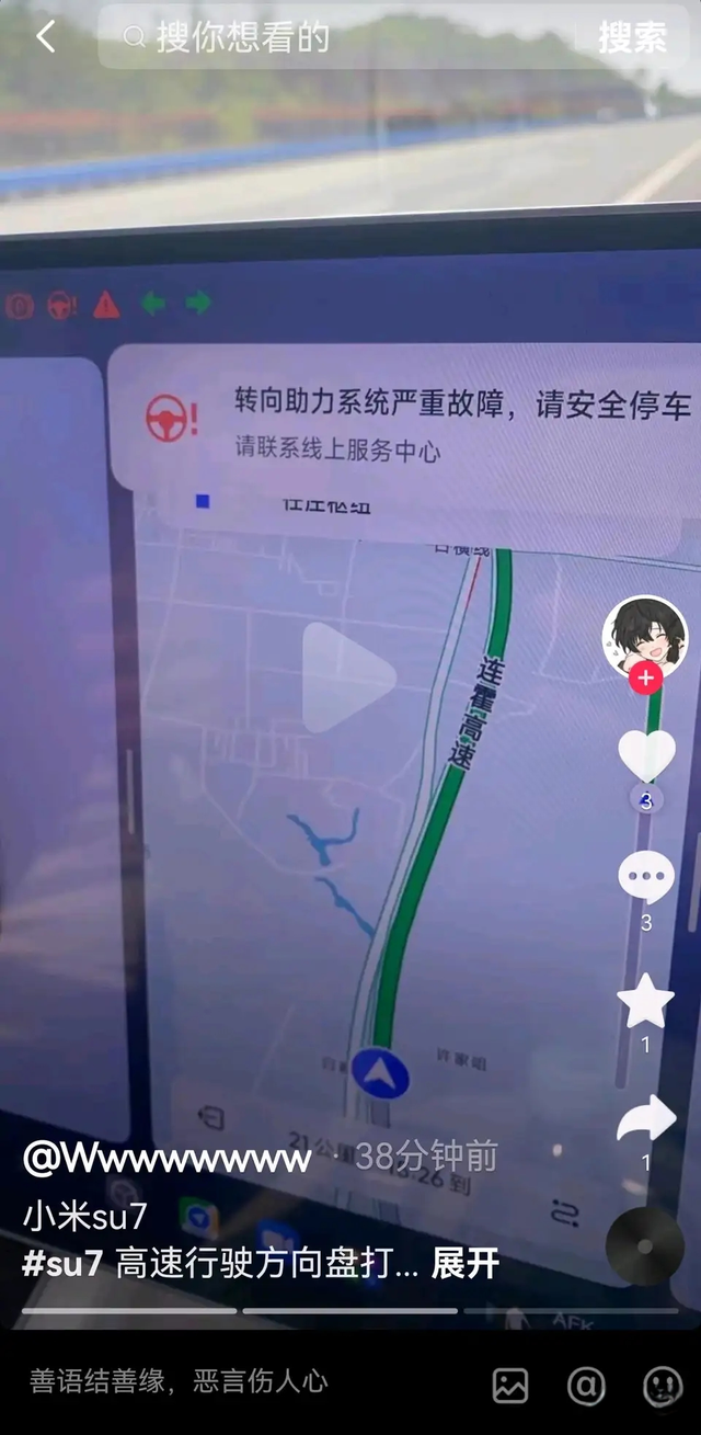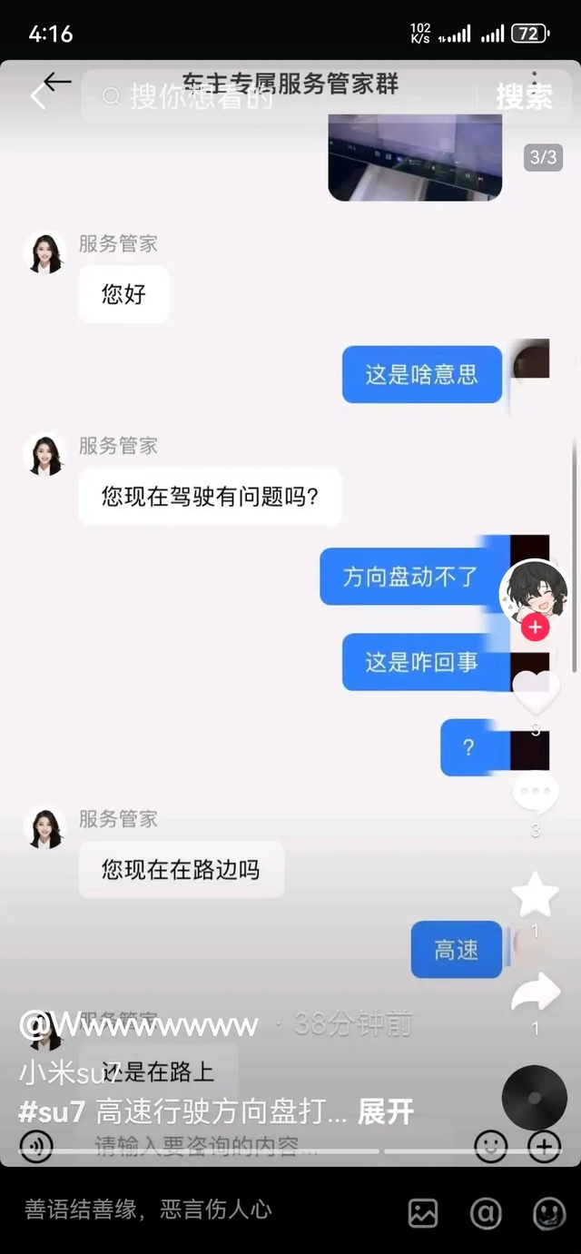 高速上方向盘失去助力 我服了,车主是西安的。高速上出故障被迫停车,车主孤立无援,选择了坐在车里跟客服线上对话。这简直是刷新吾辈三观了。