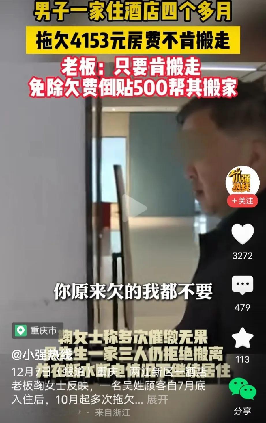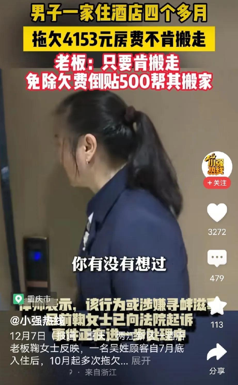 重庆,男子想带孩子和母亲住高档酒店享受生活,可自己又没钱,他想到了一个招数,当起了老赖,住酒店前面2个月准时准点付房费,2个月后,耍起了无赖,不付费也不搬走,死皮赖脸当起了无赖。店老板无奈,提出给他找便宜房租,还出500块搬家费,男子回了一句“你算哪把夜壶,想要钱,去法院起诉我。”网友:对付老赖,就用老赖的做法,不惯着。 菊女士在重庆某地开了一家酒店,她为人善良大方,不管是对待员工还是顾客都很友善。 今年7月底,吴先生带着他80多岁的老妈和10岁的儿子入住到菊女士的酒店。 服务员看到男子带着年迈的母亲和幼小的孩子来入住,很体谅男子,事事都优先考虑他们一家三人。 一开始吴先生也显得客客气气,彬彬有礼,每天140元的房费也准时准点的交,让人感觉他是一个守信用,很负责人的人。 菊女士心疼吴先生的孩子跟着大人在外住酒店,怕孩子不习惯,尽量给孩子和80多岁的母亲问候和关怀,还给他的孩子免费送牛奶。 可随着时间的推移,吴先生渐渐露出本性,房费先是拖延时间付,后面就是隔几天再付。 起初服务员也没有催,毕竟住了几个月的老熟客,对他是足够信任,但久而久之,吴先生要么是躲着不见人,要么直接说没钱,不付费了。 服务员把这个情况告诉菊女士,菊女士本着体谅吴先生不容易的心思,缓缓他些许时日。 谁料,吴先生得寸进尺直接把酒店当成了家,白吃白喝白住,怎么劝都不缴费,怎么赶都赶不走。 直到现在已经住了4个多月,欠款5000多元。 菊女士考虑到不能这么惯着他,但是用尽了各种办法,赶不走,本想来点狠的,可当她看到吴先生80多岁的老母亲和年幼的孩子,又于心不忍。 最终,菊女士亲自到酒店周边找了房子,跟人谈了最便宜的房租费用。 他告诉吴先生,已经帮你联系到房子,你到外面租房,房费相对周边是最便宜的。 可吴先生不为所动,更不把菊女士的话当一回事。 无奈的菊女士提出,给他500块搬家费,让他尽快搬走,吴先生还是不乐意。 菊女士没办法找来了记者,吴先生对记者说,他之所以不搬走是有苦衷的。 记者问他是什么原因? 吴先生告诉记者,他有案件需要去法院处理,人家欠了他十几万外债至今未还,而菊女士的酒店是离法院最近的酒店,所以他选择住这里。 吴先生表示,他的欠款一旦到手立马还钱给菊女士,但是记者要求他提供证据,他却交不出任何证据,并表示,如果菊女士想要钱,两人之间这属于经济纠纷,菊女士可以去法院告他。 菊女士提出让他先搬走,之前的房费可以不要了。吴先生一听,怼菊女士道:“你算哪把夜壶?” 目前,菊女士已经走法律途径,想要通过法律途径来维权,案件正在进一步调查中。 有人说,对付老赖,真没必要讲情面、留余地,就该用“以赖制赖”的硬办法不惯着! 吴先生拿着他人的善良当筹码,蹭住酒店四个月欠款不还,面对店主的让步还恶语相向,这种“软柿子专挑软的捏”的无赖行径,本就不该被纵容。 对老赖心软,就是对诚信者的伤害。 店主已做到仁至义尽,主动找房还出搬家费,换来的却是羞辱与得寸进尺。 其实大家说的“用老赖的办法对付老赖”,不是鼓励暴力冲突,而是要放下不必要的共情,果断走法律途径,让失信者付出代价。 该起诉就起诉,该申请强制执行就强制执行,让他在征信污点、限制消费的约束下,为自己的无赖行为买单。只有守住底线、硬起手腕,才能遏制歪风,不让善良被践踏。 那么,从法律角度如何看待这个事呢? 1. 《民法典》第509条第1款规定,当事人应当按照约定全面履行自己的义务。吴先生入住酒店后,双方虽无书面合同,但实际形成合法住宿服务合同,140元/天房费是明确约定的付款义务。 他前期按时缴费确认了合同合意,后期无正当理由拖欠5000余元房费,经酒店多次催告、甚至作出免欠费、补搬家费的让步后仍拒绝履行,违反“全面履行”原则,构成根本违约。 依据该条,菊女士有权要求其支付全部拖欠房费,还可主张逾期利息及房间空置的可得利益损失。 另外,《民法典》第236条规定,妨害物权或者可能妨害物权的,权利人可以请求排除妨害或者消除危险。 菊女士作为酒店合法经营者,对客房享有占有、使用、收益的物权性权利,吴先生欠费后拒不搬离,导致房间无法正常出租,直接妨害了菊女士的物权行使。 他声称“有外债未收回”“离法院近”并非法定免责事由,不能成为侵占他人合法财产的借口。 依据该条,菊女士有权要求吴先生立即搬离,通过诉讼及后续强制执行实现权利,合法维护自身经营权。 我想说,吴先生这操作真是又自私又无赖!拿着店主的善良当理所当然,蹭住还恶语相向,完全没底线。 菊女士仁至义尽,让步到免房费、出搬家费,换来的却是羞辱,换谁都寒心。 对付这种老赖,就不该心软,法律就该给他点教训,让他知道失信的代价,也别让善良的人受委屈。 关注@猫眼学法 品读案例故事,学习法律经验