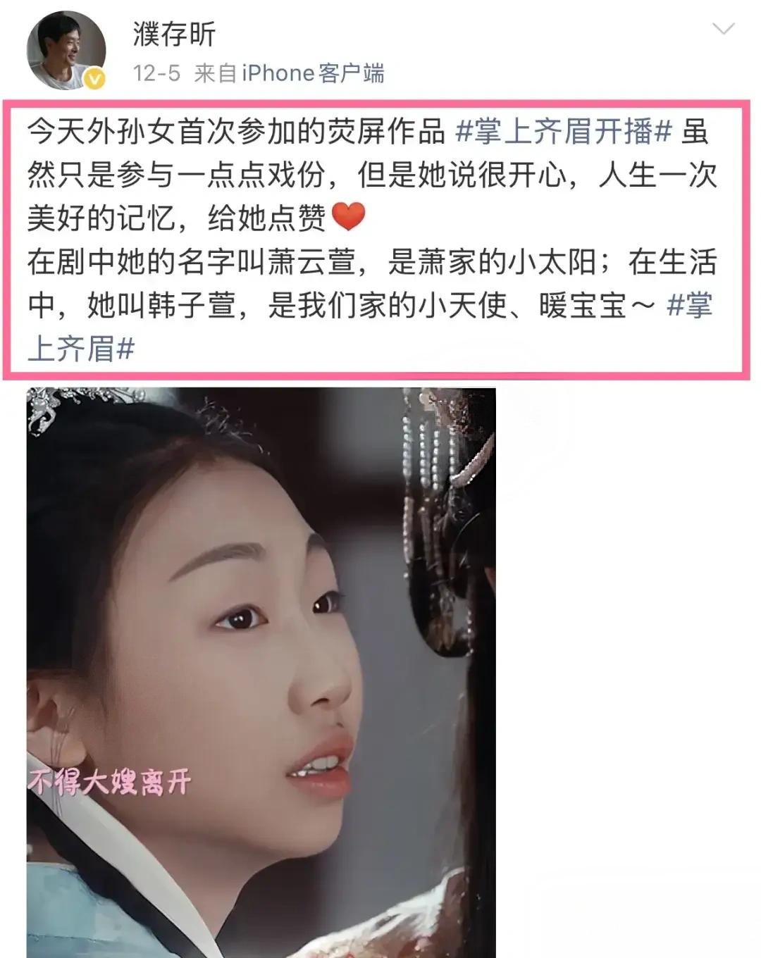 72岁的濮存昕罕见连发三条动态,为自己11岁的外孙女新剧宣传。但是孩子长相却被网友说成不适合当演员。 “星三代”都开始进军娱乐圈了。网友对“星二代”褒贬不一,对“星三代”更为苛刻。