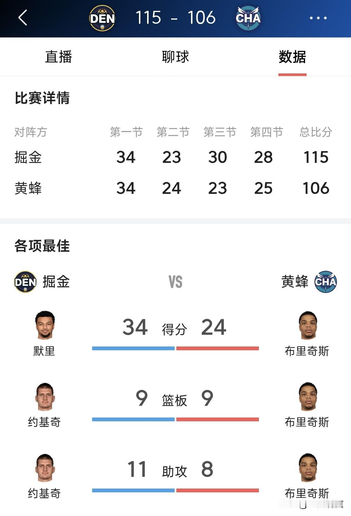 又是差一个篮板,我以为今天会轻松拿到三双结果又失算了!掘金客场115比106黄蜂取得三连胜重回西部第二,本场比赛约基奇拿到28分11助攻9篮板,默里拿到34分,在第四节看到约基奇只差两个篮板球就上双了,结果比赛结束还是差一个。还是和大O差六次。