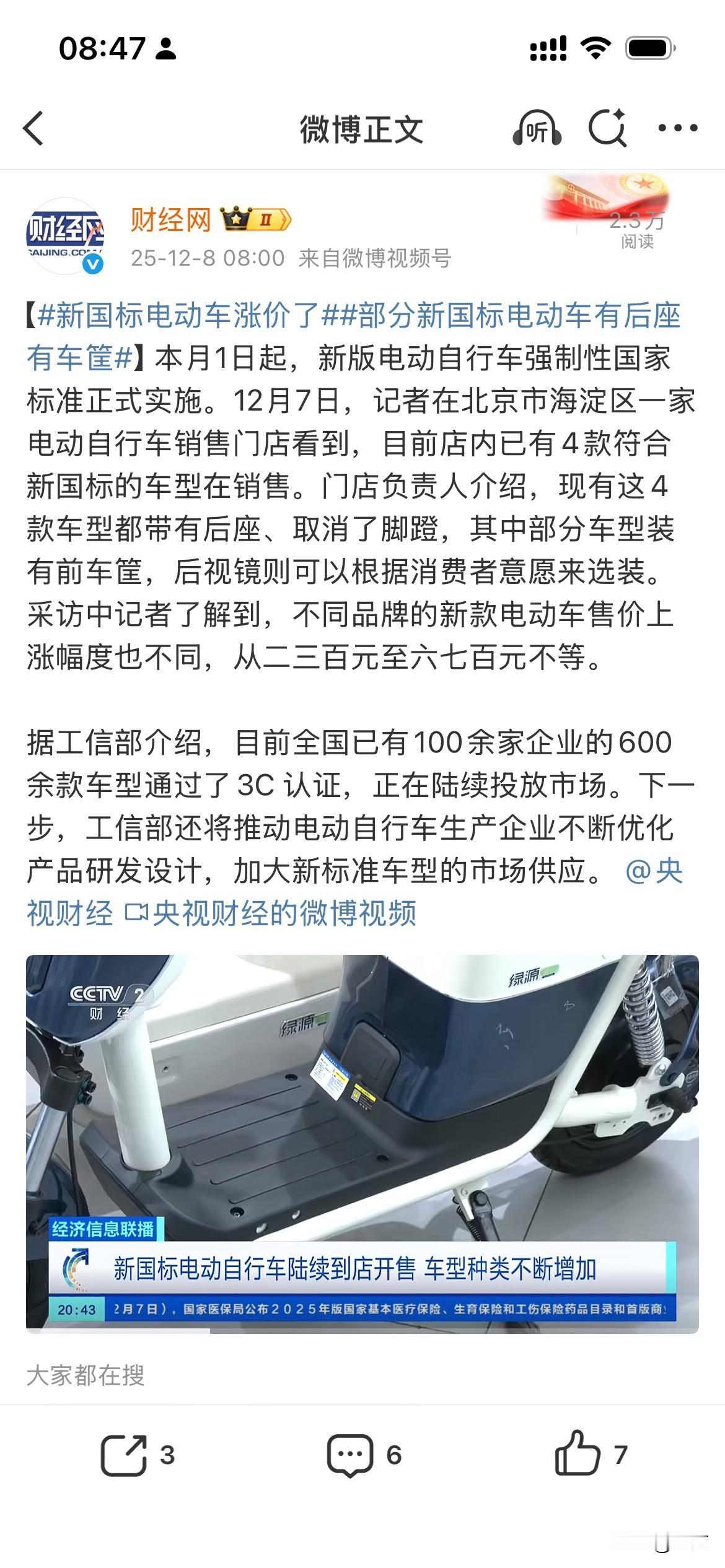 央视:新国标电动车涨价了! 今天早上,央视新闻专门报道的新的国标电动车,最新的
