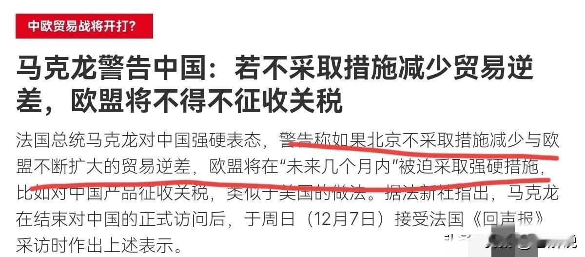 简直不敢相信,这话是从马克龙口中说出来!刚访华结束,马克龙口风变得非常强硬!12月7日,根据法新社报道,法国总统马克龙接受采访时表示,如果北京不采取措施减少与欧盟不断扩大的贸易逆差,欧盟将在“未来几个月内”被迫采取强硬措施,比如对中国产品征收关税,类似于美国的做法。 马克龙这趟访华回去后说话变凶了,在我看来,其实是演给国内和欧洲看的。他夹在中间挺难的——欧洲买中国货多、卖给中国少,国内企业又抱怨竞争不过,他必须装出“强硬保护欧洲”的样子。但实际上,他能用的招数没几张牌。 欧洲现在心里发慌,根本原因是自家产业竞争力不如以前了。马克龙说中国“冲击”欧洲工业,这话一半对一半错。对的是,中国在电动车、新能源这些新领域跑得确实快;错的是,欧洲自己问题更大——这些年工厂外迁、能源贵、新技术落地慢,以前厉害的像机床、汽车行业都遇到挑战。 说难听点,欧洲的焦虑是对自己发展不顺的反思,甚至法国媒体都自嘲“中国倒像发达国家,我们像发展中国家”。但自己身体不好,却怪别人身体太强壮,这说不通。 马克龙说要中国少出口、多来欧洲投资,还要求投资不能是“掠夺性”的,这本身就有点别扭。欧洲一边盼着中国钱来拉动经济、创造就业,比如匈牙利引进比亚迪建厂,确实带来了工作岗位;一边又怕技术被学、市场被占。 这种“既想要又不敢全要”的心态,正好说明欧洲还没想清楚该怎么和中国打交道。它指望中国企业来欧洲开厂雇人,带动本地经济,就好比请人来家里做饭,却要求人家只能干活、不准动厨房摆设,这在实际生意场上很难实现。 至于威胁要对中国加税,学美国那套,更多是谈判时虚张声势。欧盟内部自己意见就不齐:德国汽车业很依赖中国市场,公开反对高关税;匈牙利、希腊这些国家也看重中国投资。 马克龙嘴上说得硬,但欧盟真想动用所谓“贸易核武器”反制中国,得27个国家多数同意,非常难操作。更何况中国手上有稀土这类关键资源(全球九成稀土磁铁靠中国),也有办法反制。欧洲在新能源、电动车等领域,其实离不开中国的供应链。真打贸易战,欧洲企业可能先撑不住。 说到底,马克龙态度变硬,反映的是欧洲在全球化里的矛盾心态——既离不开中国市场的红利(比如空客过半飞机卖给中国),又不习惯在多极化世界里和中国平等合作。马克龙想学美国挥关税大棒,但欧洲没有美国那么大的国内市场来承受“脱钩”的代价。 他唱强硬戏,一方面是演给国内选民看,显示自己在维护欧洲利益;另一方面也是向中国喊话,想多捞点谈判筹码,比如在电动车定价、关键原材料准入上拿到更好条件。 这件事最后怎么收场,还得看双方现不现实。欧洲得承认中国产业进步是正常发展,别老扣“不公平竞争”的帽子;中国也可以考虑用一些开放措施(比如简化稀土出口程序)缓解欧洲的担心,换来更多市场空间。 如果欧洲老用“双标”对中国,保护主义短期可能护住几个企业,长期只会让自己更落后。就像中欧在绿色农业、光伏上曾经合作那样,一起开发第三方市场、共同定标准,才是正道。 马克龙的硬话听听就好,关键看后面怎么做——如果欧洲一直在“对抗”和“合作”之间摇摆,吃亏最多的恐怕是自己。