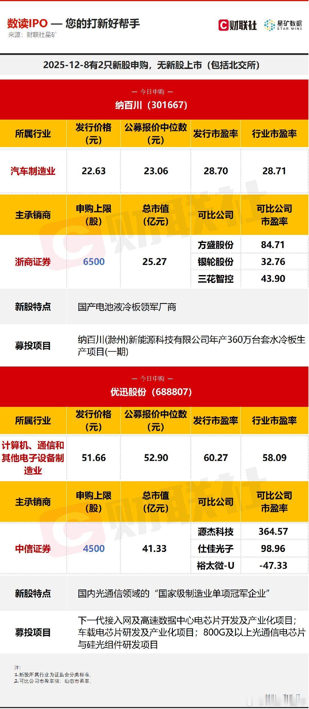 今日有2只新股申购,分别为创业板的纳百川,科创板的优迅股份;无新股上市 A股