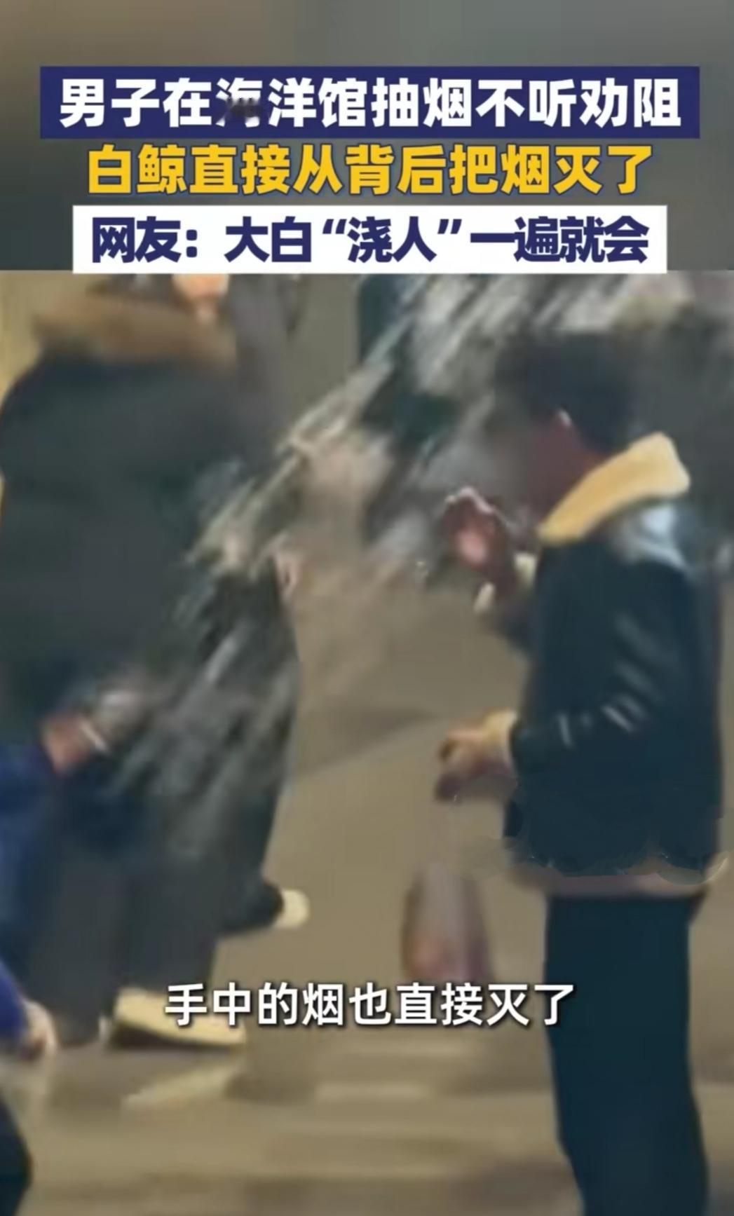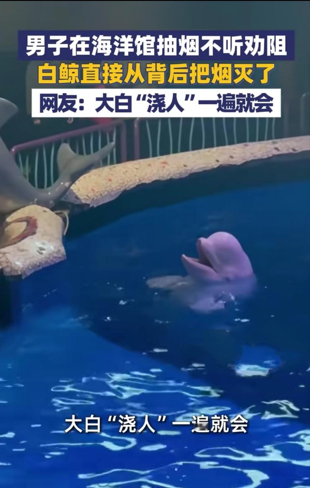 大连一海洋馆里,一名男子当众抽烟,工作人员多次上前劝阻,他却充耳不闻,态度十分嚣张。让人没想到的是,旁边水池里的一头白鲸突然跃出,一口就将他手里的香烟打落,全场瞬间沸腾。 网友纷纷点赞,都说这白鲸比有些人还懂规矩。海洋馆本是大家休闲、了解海洋生物的地方,更是对空气质量要求极高的场所,抽烟不仅违反规定,还会影响动物和其他人的健康。 可总有一些人,把公共场所当自家客厅,无视规则,肆意妄为。反倒是被人类圈养的白鲸,用最直接的方式,给我们上了一堂关于“敬畏”的课——敬畏规则,敬畏自然,更要敬畏我们共同的生存空间。