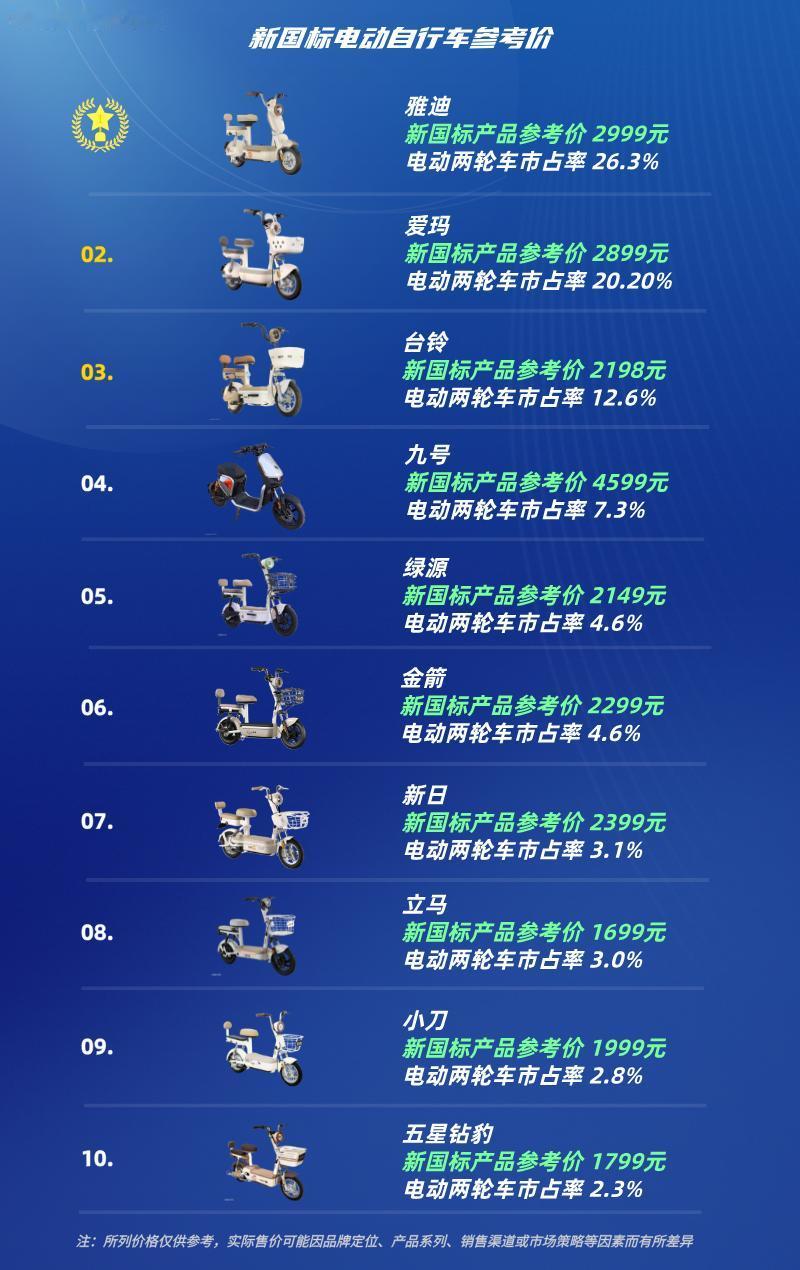 新国标电动自行车多少钱? 2025电动自行车价格 五星钻豹(1799) 小刀(1999) 立马(1699) 新日(2399) 金箭(2299) 绿源(2149) 九号(4599) 台铃(2198) 爱玛(2899) 雅迪(2999) 2025年12月,新新国标电动自行车普遍上涨300-500【来自懂车帝车友圈】
