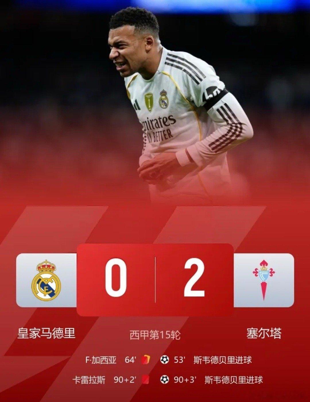 姆巴佩 主场爆冷、损兵折将西甲第15轮,皇家马德里坐镇主场迎战来访的塞尔塔,米利唐伤退、加西亚和卡雷拉斯均吃到红卡,皇马主场0-2爆冷不敌塞尔塔,落后榜首的巴萨已经达到四分!本场比赛主场作战的皇家马德里输球又输人,虽有58%的控球率和8次角球,但23次射门7次射正、四次得分机会全部无功而返,还吃到两张红卡和六张黄卡,补时丢掉第二球时,伯纳乌球场爆发出了漫天嘘声,阿隆索在加西亚吃到红卡时甚至暴怒“弗兰,别搞我啊!”显而易见的是皇马现在的问题不仅仅是主教练,球员已经无心踢球,如果说落后巴萨四分不是大问题,那么下一场联赛面对阿拉维斯皇马将会无边卫可用,卡雷拉斯、加西亚停赛,阿诺德、门迪、卡瓦哈尔伤停!皇马最近五轮联赛1胜3平1负,仅拿到6分,从领先巴萨五分到落后四分,皇马这五轮疯狂丢掉九分!