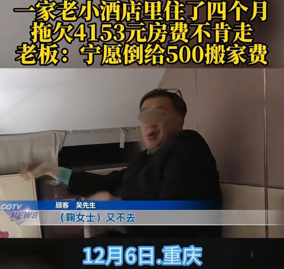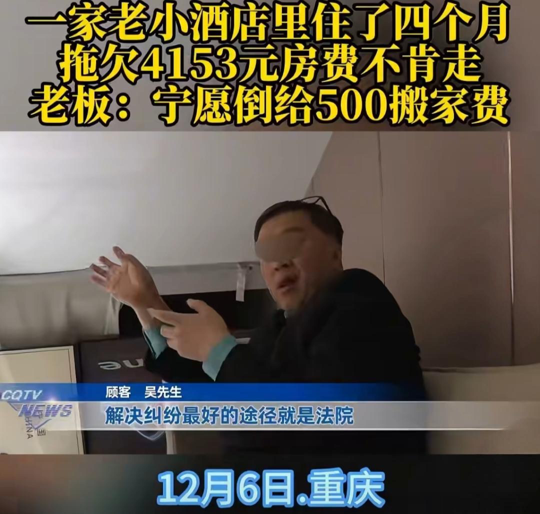 男子欠酒店4千房费赖着不走,老板急得倒贴500求搬家:人终于走了。 重庆这家