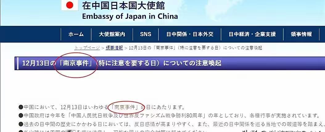 日本驻中国大使馆12月13日发通知提醒在华日本人注意安全,内容里把南京大屠杀称为“南京事件”。这天是中国南京大屠杀死难者国家公祭日,也是抗日战争胜利80周年重要日子。通知还提到最近中日关系紧张,尤其日本首相高市早苗说台湾有事就是日本有事,引发中国不满。 日本大使馆在提醒里只说“反日情绪可能高涨”,没提当年日军暴行。中国舆论批评日本至今不承认错误,仍用模糊说法淡化历史。两国在历史认知上分歧大,比如日本教科书对战争描述一直受争议,而南京扩建纪念馆保存证据。 现在双方围绕领土、历史等问题摩擦不断。专家说经济合作难掩盖政治矛盾,年轻一代对历史认知差距还在。
