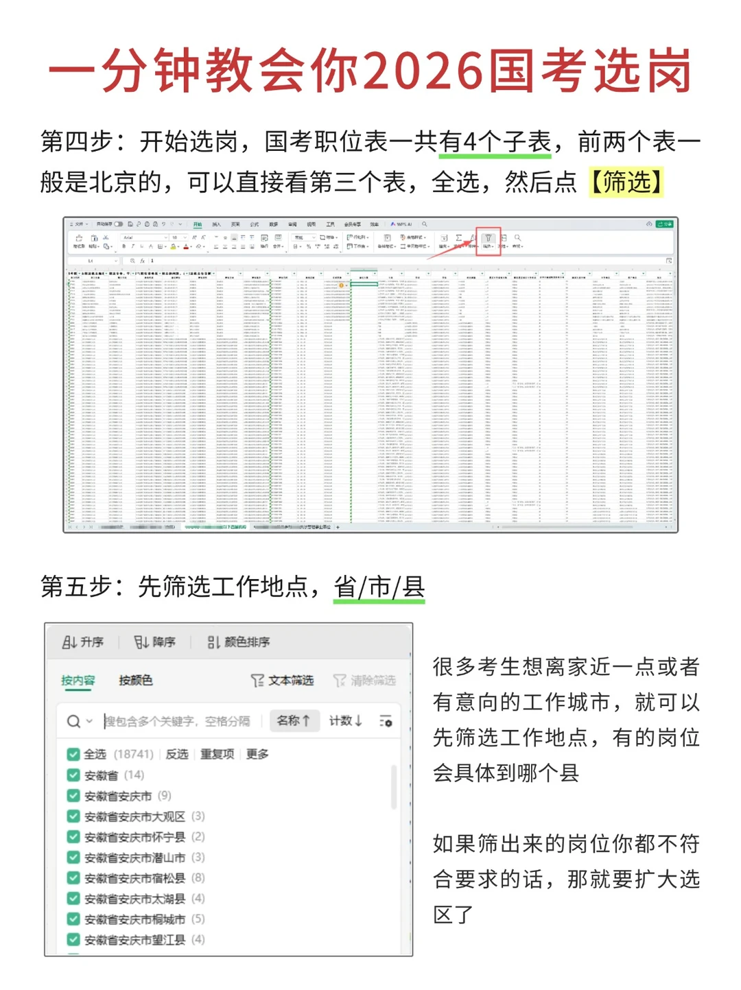 ⭕4、开始选岗,国考职位表一共有4个子表,前两个表一般是北京的,可以直接看第三个表,全选,然后点【筛选】