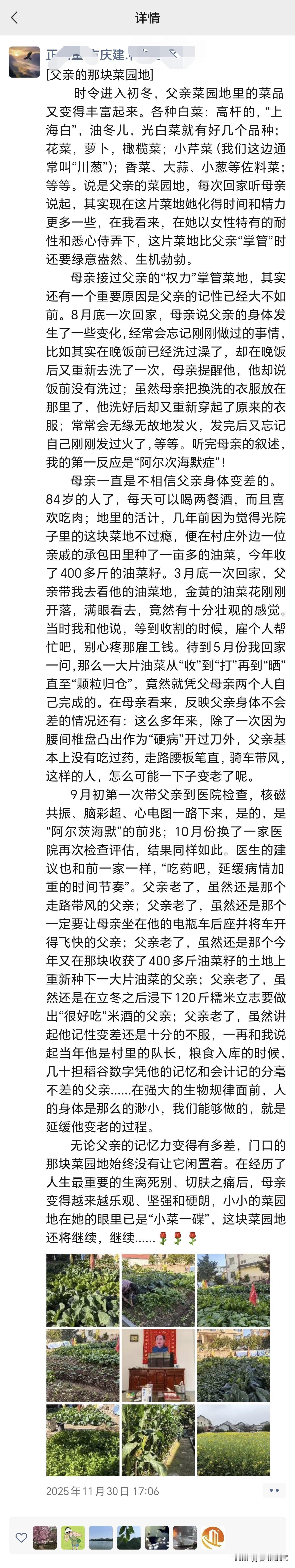 一得斋:父亲的那块菜园地 时令进入初冬,父亲菜园地里的菜品又变得丰富起来。各种白菜:高杆的,“上海白”,油冬儿,光白菜就有好几个品种;花菜,萝卜,橄榄菜;小芹菜(我们这边通常叫“川葱”);香菜、大蒜、小葱等佐料菜;等等。说是父亲的菜园地,每次回家听母亲说起,其实现在这片菜地她化得时间和精力更多一些,在我看来,在她以女性特有的耐性和悉心侍弄下,这片菜地比父亲“掌管”时还要绿意盎然、生机勃勃。 母亲接过父亲的“权力”掌管菜地,其实还有一个重要原因是父亲的记性已经大不如前。8月底一次回家,母亲说父亲的身体发生了一些变化,经常会忘记刚刚做过的事情,比如其实在晚饭前已经洗过澡了,却在晚饭后又重新去洗了一次,母亲提醒他,他却说饭前没有洗过;虽然母亲把换洗的衣服放在那里了,他洗好后却又重新穿起了原来的衣服;常常会无缘无故地发火,发完后又忘记自己刚刚发过火了,等等。听完母亲的叙述,我的第一反应是“阿尔次海默症”! 母亲一直是不相信父亲身体变差的。84岁的人了,每天可以喝两餐酒,而且喜欢吃肉;地里的活计,几年前因为觉得光院子里的这块菜地不过瘾,便在村庄外边一位亲戚的承包田里种了一亩多的油菜,今年收了400多斤的油菜籽。3月底一次回家,父亲带我去看他的油菜地,金黄的油菜花刚刚开落,满眼看去,竟然有十分壮观的感觉。当时我和他说,等到收割的时候,雇个人帮忙吧,别心疼那雇工钱。待到5月份我回家一问,那么一大片油菜从“收”到“打”再到“晒”直至“颗粒归仓”,竟然就凭父母亲两个人自己完成的。在母亲看来,反映父亲身体不会差的情况还有:这么多年来,除了一次因为腰间椎盘凸出作为“硬病”开过刀外,父亲基本上没有吃过药,走路腰板笔直,骑车带风,这样的人,怎么可能一下子变老了呢。 9月初第一次带父亲到医院检查,核磁共振、脑彩超、心电图一路下来,是的,是“阿尔茨海默”的前兆;10月份换了一家医院再次检查评估,结果同样如此。医生的建议也和前一家一样,“吃药吧,延缓病情加重的时间节奏”。父亲老了,虽然还是那个走路带风的父亲;父亲老了,虽然还是那个一定要让母亲坐在他的电瓶车后座并将车开得飞快的父亲;父亲老了,虽然还是那个今年又在那块收获了400多斤油菜籽的土地上重新种下一大片油菜的父亲;父亲老了,虽然还是在立冬之后浸下120斤糯米立志要做出“很好吃”米酒的父亲;父亲老了,虽然讲起他记性变差还是十分的不服,一再和我说起当年他是村里的队长,粮食入库的时候,几十担稻谷数字凭他的记忆和会计记的分毫不差的父亲......在强大的生物规律面前,人的身体是那么的渺小,我们能够做的,就是延缓他变老的过程。 无论父亲的记忆力变得有多差,门口的那块菜园地始终没有让它闲置着。在经历了人生最重要的生离死别、切肤之痛后,母亲变得越来越乐观、坚强和硬朗,小小的菜园地在她的眼里已是“小菜一碟”,这块菜园地还将继续,继续......[玫瑰][玫瑰][玫瑰] 老家园蔬菜 一得斋