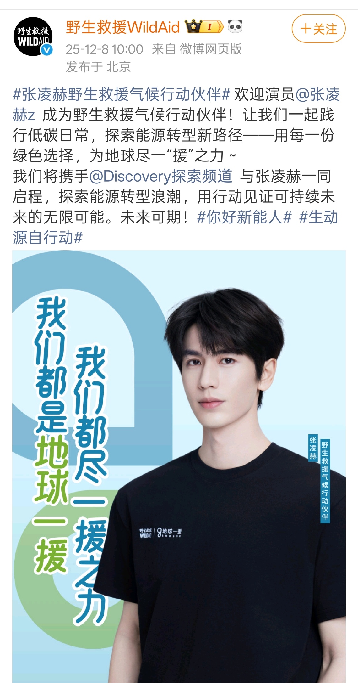 张凌赫官宣野生救援气候行动伙伴!就这个根正苗红
