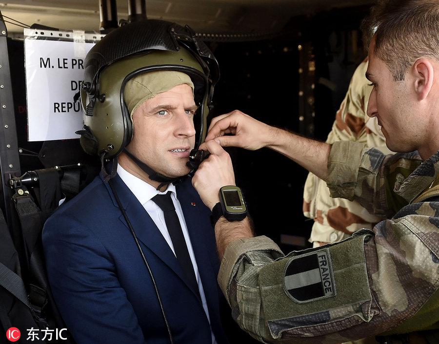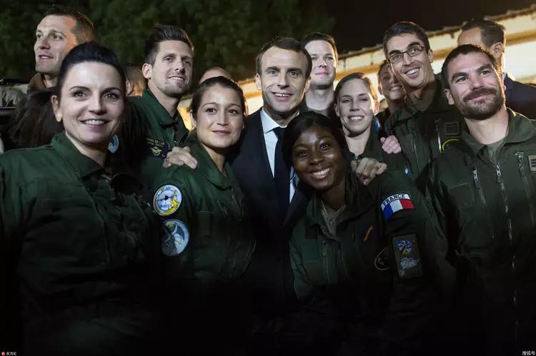 马克龙和士兵在一起,他手搭肩膀的那两个女兵一个是黄皮肤一个是黑皮肤。那些女兵笑得都很灿烂,马克龙挺受她们欢迎的。